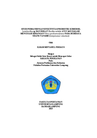 Ilham Miftahul , Firdaus (2025) Studi Perbandingan Efektivitas Probiotik Lactobacillus sp dan Isolat Bacillus subtilis ATCC 6643 Terhadap Serangan Vibrio parahaemolyticus Pada Budidaya Udang Vaname (Litopenaeus vannamei). FAKULTAS PERTANIAN, UNIVERSITAS LAMPUNG .