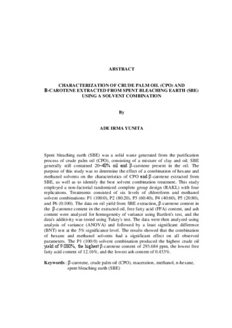 Ade Irma , Yunita (2025) KARAKTERISASI CRUDE PALM OIL (CPO) DAN β-KAROTEN HASIL EKSTRAKSI SPENT BLEACHING EARTH (SBE) MENGGUNAKAN KOMBINASI PELARUT. FAKULTAS PERTANIAN, UNIVERSITAS LAMPUNG. (Submitted)