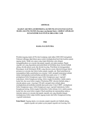 Rama , Fauzi Putra (2025) KAJIAN AKUMULASI BIOMASSA, KANDUNGAN K DAN KUALITAS HASIL JAGUNG MANIS (Zea mays saccharata Sturt.) AKIBAT APLIKASI ECO-ENZYME DAN PUPUK ORGANIK CAIR. FAKULTAS PERTANIAN, UNIVERSITAS LAMPUNG.