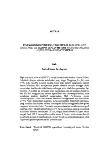 High acid crude palm oil (HACPO) merupakan salah satu sumber vitamin E alami (tokoferol) dengan aktivitas antioksidan yang tinggi. Tingginya free fatty acid (FFA) pada HACPO menjadi masalah besar bagi industri pengolahan minyak karena kelebihan FFA mempercepat proses oksidasi minyak sehingga dapat menurunkan kualitas dan stabilitasnya sehingga perlu dilakukan pemisahan dari tokoferol. Penelitian ini bertujuan untuk memisahkan dan memurnikan tokoferol dari HACPO menggunakan metode saponifikasi dan kromatografi kolom, serta melakukan analisis kualitatif menggunakan High Performance Liquid Chromatography (HPLC) dan analisis kuantitatif menggunakan spektrofotometer Uv-Vis. Proses saponifikasi dilakukan untuk memisahkan fraksi tak tersabunkan, yang kemudian dimurnikan melalui kromatografi kolom menggunakan fase gerak campuran heksan:dietil eter. Pemisahan senyawa dianalisis melalui kromatografi lapis tipis (KLT). Hasil Spektrofotometer UV-Vis menunjukkan panjang gelombang maksimum tokoferol berada pada 287 nm, dengan kadar sebesar 68,2 ppm dalam sampel. Hasil HPLC menunjukkan waktu retensi 3,7 menit untuk standar dan 4,1 menit untuk sampel, terdapat selisih 0,4 menit. Teknik ini perlu dikembangkan lebih lanjut untuk proses optimasi dalam pemurniannya. Kata Kunci : Tokoferol, HACPO, saponifikasi, kromatografi kolom, Uv-Vis, HPLC High acid crude palm oil (HACPO) is a natural source of Vitamin E (tocopherol) with high antioxidant activity. The high level of free fatty acid (FFA) in HACPO is a major problem for the oil processing industry because the excess FFA accelerates the oil's oxidation process, which can reduce its quality and stability, making it necessary to separate it from tocopherol. This research aims to separate and purify tocopherol from HACPO using saponification and column chromatography methods, and to perform qualitative analysis using High Performance Liquid Chromatography (HPLC) and quantitative analysis using a UV-Vis spectrophotometer. The saponification process was carried out to separate the unsaponifiable fraction, which was then purified through column chromatography using a hexane:diethyl ether mixture as the mobile phase. Compound separation was analyzed through Thin Layer Chromatography (TLC). The UV-Vis Spectrophotometer results showed the maximum wavelength of tocopherol was at 287 nm, with a content of 68.2 ppm in the sample. The HPLC results showed a retention time of 3.7 minutes for the standard and 4.1 minutes for the sample, with a difference of 0.4 minutes. This technique needs to be further developed for the optimization process in its purification. Keywords: Tocopherol, HACPO, saponification, column chromatography, UV-Vis, HPLC.