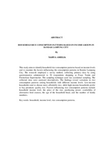 This study aims to identify household rice consumption patterns based on income levels and to examine the factors influencing the consumption patterns in Bandar Lampung City. The research employed a survey method, collecting primary data by using questionnaires administered to 50 respondents shopping at Pasar Tamin and Fitrinofane Supermarket. The sampling technique used was accidental sampling. The collected data were analyzed descriptively. The findings reveal variations in rice consumption patterns among households with different income levels. Low-income households tend to choose more affordable rice, while high-income households prefer to buy premium- quality rice. Factors influencing rice consumption patterns include household income level, the price of the rice, purchasing power, availability of alternative food sources, the age of the household head, and the number of family members. Key words: household, income level, rice consumption patterns. Studi ini bertujuan untuk mengidentifikasi pola konsumsi beras rumah tangga berdasarkan tingkat pendapatan dan untuk memeriksa faktor-faktor yang mempengaruhi pola konsumsi tersebut di Kota Bandar Lampung. Penelitian ini menggunakan metode survei, mengumpulkan data primer melalui kuesioner yang disebarkan kepada 50 responden yang berbelanja di Pasar Tamin dan Supermarket Fitrinofane. Teknik pengambilan sampel yang digunakan adalah pengambilan sampel secara kebetulan. Data yang dikumpulkan dianalisis secara deskriptif. Temuan menunjukkan variasi dalam pola konsumsi beras di antara rumah tangga dengan tingkat pendapatan yang berbeda. Rumah tangga dengan pendapatan rendah cenderung memilih beras yang lebih terjangkau, sementara rumah tangga dengan pendapatan tinggi lebih suka beras berkualitas premium. Faktor-faktor yang mempengaruhi pola konsumsi beras mencakup tingkat pendapatan rumah tangga, harga beras, daya beli, ketersediaan sumber makanan alternatif, usia kepala rumah tangga, dan jumlah anggota keluarga. Kata kunci: pola konsumsi beras, rumah tangga, tingkat pendapatan.