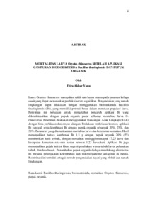 Larva Oryctes rhinoceros merupakan salah satu hama utama pada tanaman kelapa sawit yang dapat menurunkan produksi secara signifikan. Pengendalian yang ramah lingkungan dapat dilakukan dengan menggunakan bioinsektisida Bacillus thuringiensis (Bt), yang memiliki potensi besar dalam menekan populasi larva. Penelitian ini bertujuan untuk mengetahui pengaruh aplikasi Bt yang dikombinasikan dengan pupuk organik padat terhadap mortalitas larva O. rhinoceros. Penelitian dilakukan menggunakan Rancangan Acak Lengkap (RAL) dengan lima perlakuan dan empat ulangan. Perlakuan terdiri atas kontrol, aplikasi Bt tunggal, serta kombinasi Bt dengan pupuk organik sebanyak 20%, 25%, dan 30%. Parameter yang diamati adalah mortalitas larva dan kecepatan kematian. Hasil menunjukkan bahwa kombinasi Bt 1,5 g dengan pupuk organik 20% (P2) memberikan hasil terbaik, dengan mortalitas tertinggi mencapai 17,25 larva dan kecepatan kematian rata-rata harian sebesar 1,23 larva/hari. Aplikasi Bt juga menunjukkan gejala infeksi khas, seperti perubahan warna tubuh larva, pelunakan tubuh, dan bau busuk. Penambahan pupuk organik diduga mendukung efektivitas Bt melalui peningkatan kelembaban dan mikroorganisme antagonis di media. Kombinasi ini terbukti sebagai metode pengendalian hayati yang efektif dan ramah lingkungan. Kata kunci: Bacillus thuringiensis, bioinsektisida, mortalitas, Oryctes rhinoceros, pupuk organik. Oryctes rhinoceros larvae are one of the major pests of oil palm crops, capable of significantly reducing production. Environmentally friendly control can be achieved by using the bioinsecticide Bacillus thuringiensis (Bt), which has strong potential in suppressing larval populations. This study aimed to determine the effect of Bt combined with solid organic fertilizer on the mortality of O. rhinoceros larvae. The experiment was conducted using a Completely Randomized Design (CRD) with five treatments and four replications. The treatments consisted of a control, Bt application alone, and Bt combined with 20%, 25%, and 30% organic fertilizer. Observed parameters were larval mortality and mortality rate. Results showed that the combination of 1.5 g Bt with 20% organic fertilizer (P2) yielded the best results, with the highest mortality of 17.25 larvae and an average daily mortality rate of 1.23 larvae/day. Bt application caused typical infection symptoms, such as larval body discoloration, softening, and foul odor. The addition of organic fertilizer likely enhanced Bt effectiveness by increasing moisture and antagonistic microorganisms in the medium. This combination proved to be an effective and environmentally friendly biological control method. Keywords: Bacillus thuringiensis, bioinsecticide, mortality, Oryctes rhinoceros, organic fertilizer.