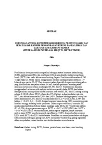 Penelitian ini bertujuan untuk mengetahui hubungan antara konsumsi bahan kering (KBK), protein kasar (PK), dan serat kasar (SK) dengan kualitas bahan kering tanpa lemak (BKTL) dan kadar laktosa susu kambing Sapera. Penelitian dilaksanakan di P4S Telaga Rizqy 21, Metro Timur, menggunakan 20 ekor kambing Sapera laktasi III--IV bulan dengan paritas III--IV. Data konsumsi pakan diperoleh dengan menimbang pakan yang diberikan dan sisa pakan selama 14 hari. Analisis proksimat terhadap pakan dilakukan untuk menentukan kandungan BK, PK, dan SK. Kualitas susu dianalisis menggunakan Lactoscan milk analyzer untuk memperoleh kadar BKTL dan laktosa. Hasil penelitian menunjukkan bahwa konsumsi rata-rata BK, PK, dan SK masing-masing sebesar 1.245,49 g/hari, 209,15 g/hari, dan 275,62 g/hari, sedangkan kadar rata-rata BKTL dan laktosa susu adalah 7,80% dan 3,48%. Terdapat hubungan positif cukup kuat antara konsumsi BK, PK, dan SK terhadap kadar BKTL (r = 0,458; 0,430; 0,449) dan laktosa (r = 0,452; 0,411; 0,443), dengan konsumsi bahan kering (BK) menunjukkan nilai korelasi tertinggi terhadap kedua parameter. Dalam regresi sederhana, konsumsi BK memberikan kontribusi terbesar dalam menduga kadar BKTL (R2 = 0,210) dan laktosa (R2 = 0,204), dengan persamaan regresi: BKTL = −6,627 + 0,012(KBK) dan LAKT = −3,416 + 0,005(KBK). Namun demikian, dalam regresi berganda, hanya konsumsi protein kasar (KPK) yang berpengaruh signifikan (p < 0,05), dengan koefisien regresi 0,024 untuk BKTL dan 0,011 untuk laktosa. Penelitian ini menunjukkan bahwa meskipun KBK memiliki hubungan paling kuat, KPK merupakan variabel yang paling signifikan dalam menjelaskan variasi kualitas susu ketika dianalisis secara bersama. Kata kunci: bahan kering, BKTL, laktosa, protein kasar, serat kasar, susu kambing Sapera. ABSTRACT RELATIONSHIP BETWEEN DRY MATTER CONSUMPTION, CRUDE PROTEIN, AND CRUDE FIBER IN FEED WITH THE DRY MATTER WITHOUT FAT AND LACTOSE OF SAPERA GOAT MILK (CASE STUDY AT P4S TELAGA RIZQY 21, METRO TIMUR) By Nasywa Nurwidya This study aimed to examine the relationship between dry matter (DM), crude protein (CP), and crude fiber (CF) intake with the levels of Solid Non Fat (SNF) and lactose in Sapera goat milk. The research was conducted at P4S Telaga Rizqy 21, Metro Timur, using 20 Sapera goats in the 3th--4th month of lactation and 3th--4th parity. Feed intake data were obtained by weighing feed offered and refusals over a 14-day period. Proximate analysis was performed to determine the nutrient content of the feed, while milk quality was assessed using a Lactoscan milk analyzer to determine SNF and lactose levels. The results showed average intakes of DM, CP, and CF were 1.245,49 g/day, 209,15 g/day, and 275.62 g/day, respectively, with average SNF and lactose levels of 7.80% and 3.48%. A moderately strong positive correlation was found between the intake of DM, CP, and CF with both SNF (r = 0.458; 0.430; 0.449) and lactose (r = 0.452; 0.411; 0.443), with DM showing the strongest correlation for both milk quality parameters. In simple regression, dry matter (DM) intake contributed the most in predicting the levels of non-fat dry matter (SNF) (R2 = 0.210) and lactose (R2 = 0.204), with the regression equations: SNF = −6.627 + 0.012(DM) and LACT = −3.416 + 0.005(DM). However, in multiple linear regression analysis, only crude protein intake (CP) had a statistically significant effect (p < 0.05) on both SNF (regression coefficient = 0.024) and lactose (regression coefficient = 0.011). These findings suggest that while DM intake shows the strongest individual correlation, CP intake is the most significant predictor of milk quality when all variables are considered simultaneously. Keywords: Sapera goat, dry matter, crude protein, crude fiber, solid non fat, lactose.