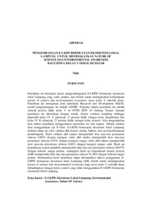 Penelitian ini bertujuan untuk mengembangakan E-LKPD bermuatan ekosistem lokal Lampung yang valid, praktis, dan efektif untuk meningkatkan kemampuan nature of science dan environmental awareness siswa kelas V sekolah dasar. Penelitian ini merupakan jenis penelitian Research and Development (R&D), model pengembangan ini adalah ADDIE. Populasi dalam penelitian ini adalah seluruh peserta didik kelas V di UPTD SDN 16 Gedong Tataan. Sampel penelitian ini ditentukan dengan teknik cluster random sampling sehingga diperoleh kelas IV A sebanyak 27 peserta didik sebagai kelas eksperimen dan kelas IV B sebanyak 27 peserta didik sebagai kelas kontrol. Alat pengumpulan data dalam penelitian menggunakan instrumen tes dan angket. Teknik analisis data menggunakan uji N-Gain. E-LKPD bermuatan ekosistem lokal Lampung melalui tahap uji coba validasi ahli materi, media, bahasa, dan uji keterlaksanaan pembelajaran. Hasil validasi ahli materi memperoleh skor rata-rata persentase sebesar 0,80% dengan kategori valid, ahli media memperoleh skor rata-rata persentase sebesar 0,93% dengan kategori sangat valid, ahli bahasa memperoleh skor rata-rata persentase sebesar 0,88% dengan kategori sangat valid. Hasil uji kepraktisan respon pendidik memperoleh nilai rata-rata presentase sebesar 88,67% dengan kriteria sangat praktis, sedangkan hasil uji kepraktisan respon peserta didik memperoleh nilai rata-rata presentase sebesar 91,48% dengan kriteria sangat praktis. Berdasarkan hasil penelitian dapat disimpulkan bahwa penggunaan ELKPD bermuatan ekosistem lokal Lampung lebih efektif untuk meningkatkan nature of science dan environmental awareness bagi siswa kelas V sekolah dasar dibandingkan dengan kelas control yang tidak menggunakan E-LKPD bermuatan ekosistem lokal Lampung. Kata Kunci : E-LKPD, Ekosistem Lokal Lampung, Environmental Awareness, Nature Of Science This research aims to produce E-LKPD changing Lampung's local ecosystem that is valid, practical, and effective for improving fifth-grade elementary school students' natural science skills and environmental awareness. This research is a type of Research and Development (R&D) research, this development refers to the ADDIE model. The population in this study were all class V students at UPTD SDN 16 Gedong Tataan. The sample for this research was determined using a cluster random sampling technique so that 27 students were taught in class IV A as the experimental class and 27 students in class IV B were taught as the control class. Data collection tools in research use test instruments and questionnaires. E-LKPD mobilizes Lampung's local ecosystem through the trial stage, validation of material, media, language experts and learning implementation tests. The validation results of material experts obtained an average percentage score of 0.80% in the valid category, media experts obtained an average percentage score of 0.93% in the very valid category, linguists obtained an average percentage score of 0.88% in the very valid category. The results of the practicality test for educators' responses obtained an average percentage value of 88.67% with very practical criteria, while the results of the practicality test for student responses obtained an average percentage value of 91.48% with very practical criteria. The data analysis technique uses the N-Gain test which can be concluded that the use of E-LKPD disrupts the Lampung local ecosystem more effectively in increasing awareness of nature and the environment for fifth grade elementary school students compared to the control class which does not use E-LKPD destroying the Lampung local ecosystem. Keywords: E-LKPD, Lampung Local Ecosystem, Environmental Awareness, Nature of Science