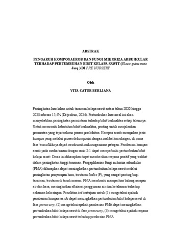 Vita, Catur Berliana (2025) PENGARUH KOMPOS AEROB DAN FUNGI MIKORIZA ARBUSKULAR TERHADAP PERTUMBUHAN BIBIT KELAPA SAWIT (Elaeis guineensis Jacq.) DI PRE NURSERY. FAKULTAS PERTANIAN, UNIVERSITAS LAMPUNG.
