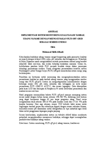Muhamad Sidik, Alfandi (0202) IMPLEMENTASI SISTEM MONITORING KUALITAS AIR TAMBAK UDANG VANAME DENGAN MENGGUNAKAN PLTS OFF-GRID SEBAGAI SUMBER ENERGI. FAKULTAS TEKNIK, UNIVERSITAS LAMPUNG.