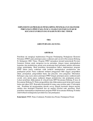 Ardi , Purnama Kusuma (2025) IMPLEMENTASI PROGRAM PENDAMPING PENINGKATAN EKONOMI PERTANIAN (PPEP) PADA PENERAPAN PANCA USAHATANI PADI SAWAH DI KECAMATAN BELITANG II KABUPATEN OKU TIMUR. FAKULTAS PERTANIAN , UNIVERSITAS LAMPUNG.
