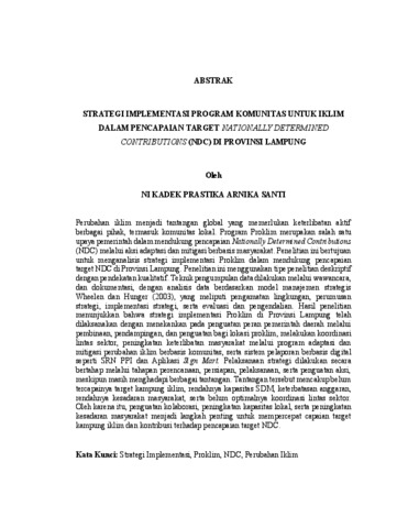 NI KADEK PRASTIKA , ARNIKA SANTI (2025) STRATEGI IMPLEMENTASI PROGRAM KOMUNITAS UNTUK IKLIM DALAM PENCAPAIAN TARGET NATIONALLY DETERMINED CONTRIBUTIONS (NDC) DI PROVINSI LAMPUNG. FAKULTAS ILMU SOSIAL DAN ILMU POLITIK, UNIVERSITAS LAMPUNG.