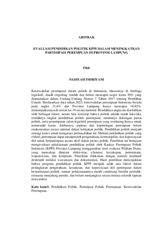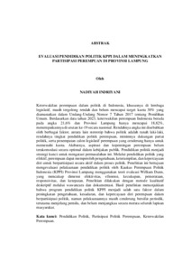 Keterwakilan perempuan dalam politik di Indonesia, khususnya di lembaga legislatif, masih tergolong rendah dan belum mencapai target kuota 30% yang diamanatkan dalam Undang-Undang Nomor 7 Tahun 2017 tentang Pemilihan Umum. Berdasarkan data tahun 2023, keterwakilan perempuan Indonesia berada pada angka 21,6% dan Provinsi Lampung hanya mencapai 18,82%, menempatkannya di urutan ke-19 secara nasional. Rendahnya angka ini disebabkan oleh berbagai faktor, antara lain stereotip bahwa politik adalah ranah laki-laki, rendahnya tingkat pendidikan politik perempuan, minimnya dukungan partai politik, serta penempatan calon legislatif perempuan yang cenderung hanya untuk memenuhi kuota. Akibatnya, aspirasi dan kepentingan perempuan belum terakomodasi secara optimal dalam kebijakan publik. Pendidikan politik menjadi strategi kunci untuk mengatasi permasalahan ini. Melalui pendidikan politik yang efektif, perempuan dapat memperoleh pengetahuan, keterampilan, dan kepercayaan diri untuk berpartisipasi secara aktif dalam proses politik. Penelitian ini bertujuan mengevaluasi pelaksanaan pendidikan politik oleh Kaukus Perempuan Politik Indonesia (KPPI) Provinsi Lampung menggunakan teori evaluasi William Dunn, yang mencakup dimensi efektivitas, efisiensi, kecukupan, pemerataan, responsivitas, dan ketepatan. Penelitian dilakukan dengan metode kualitatif deskriptif melalui wawancara dan dokumentasi. Hasil penelitian menunjukkan bahwa program pendidikan politik KPPI menjadi salah satu faktor dalam peningkatan pengetahuan, kesadaran, dan kepercayaan diri perempuan dalam berpartisipasi politik, namun pelaksanaannya masih cenderung bersifat periodik, terutama menjelang pemilu, dan belum menjangkau secara merata seluruh lapisan masyarakat. Kata kunci: Pendidikan Politik, Partisipasi Politik Perempuan, Keterwakilan Perempuan. Women’s political representation in Indonesia, particularly within legislative bodies, remains relatively low and has yet to reach the 30% quota mandated by Law No. 7 of 2017 on General Elections. According to 2023 data, women’s representation in Indonesia stands at 21.6%, while Lampung Province records only 18.82%, ranking 19th nationally. This low percentage is attributable to several factors, including the stereotype that politics is a male domain, the generally lower educational attainment among women, the limited support from political parties, and the tendency to nominate female legislative candidates merely to fulfill the quota requirement. As a result, women’s aspirations and interests are not yet optimally accommodated in public policy. Political education serves as a key strategy to address this issue. Through effective political education, women can acquire the knowledge, skills, and confidence necessary to participate actively in political processes. This study aims to evaluate the implementation of political education by the Women’s Political Caucus of Indonesia of Lampung Province, using William Dunn’s evaluation framework, which includes the dimension of effectiveness, efficiency, adequacy, equity, responsiveness, and accuracy. The research adopts a qualitative descriptive method, employing interviews and documentation. The findings indicate that KPPI’s political education programs has contributed on improving women’s knowledge, awareness, and confidence in political participation. However, their implementation remains largely periodic particularly in the lead-up to elections and has yet to reach all segments of society equally. Keywords: Political Education, Women’s Political Participation, Women Representation.