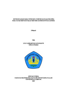 Lulu Qomariyah , Anggraeni (2025) DETEKSI KADAR HARA NITROGEN, FOSFOR DAN KALIUM (NPK) PADA TANAH MENGGUNAKAN METODE KONDUKTIVITAS LISTRIK. FAKULTAS MATEMATIKA DAN ILMU PENGETAHUAN ALAM, UNIVERSITAS LAMPUNG.