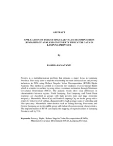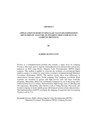 Kemiskinan merupakan permasalahan multidimensional yang masih menjadi fokus utama di Provinsi Lampung. Penelitian ini bertujuan untuk memetakan hubungan antara kabupaten/kota dengan indikator kemiskinan tahun 2024 menggunakan Analisis Biplot Robust Singular Value Decomposition (RSVD). Metode ini diterapkan untuk mengatasi kelemahan Biplot konvensional yang sensitif terhadap pencilan dengan menggunakan estimasi kovarians robust melalui Minimum Covariance Determinant (MCD). Hasil analisis menunjukkan adanya perbedaan karakteristik yang jelas antarwilayah. Kabupaten Lampung Utara, Lampung Timur, dan Pesisir Barat tergolong dalam kelompok dengan tingkat kemiskinan tinggi dan ketimpangan ekonomi yang besar. Sementara itu, Kota Metro dan Kota Bandar Lampung berada pada kelompok dengan tingkat kesejahteraan relatif lebih baik, ditandai oleh rata-rata lama sekolah dan umur harapan hidup yang tinggi. Adapun kabupaten lain seperti Tulang Bawang, Pesawaran, dan Lampung Tengah menempati kelompok menengah dengan karakteristik sosial ekonomi yang seimbang. Penerapan RSVD dapat menampilkan pemetaan Kabupaten/Kota di Provinsi Lampung dengan baik sebesar 71%. Kata Kunci: Kemiskinan, Biplot, Robust Singular Value Decomposition (RSVD), Minimum Covariance Determinant (MCD), Provinsi Lampung. abstract Poverty is a multidimensional problem that remains a major focus in Lampung Province. This study aims to map the relationship between districts/cities and poverty indicators in 2024 using Robust Singular Value Decomposition (RSVD) Biplot Analysis. This method is applied to overcome the weakness of conventional Biplot which is sensitive to outliers by using robust covariance estimation through Minimum Covariance Determinant (MCD). The analysis results show clear differences in characteristics between regions. North Lampung, East Lampung, and Pesisir Barat regencies are classified as groups with high poverty rates and large economic inequality. Meanwhile, Metro City and Bandar Lampung City are in the group with a relatively better level of welfare, characterized by high average years of schooling and life expectancy. Meanwhile, other districts such as Tulang Bawang, Pesawaran, and Central Lampung are in the middle group with balanced socioeconomic characteristics. The implementation of RSVP can display the mapping of regencies/cities in Lampung Province well by 71%. Keywords: Poverty, Biplot, Robust Singular Value Decomposition (RSVD),Minimum Covariance Determinant (MCD), Lampung Province.