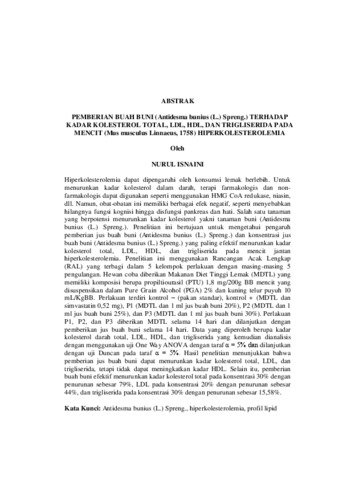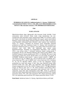 Hiperkolesterolemia dapat dipengaruhi oleh konsumsi lemak berlebih. Untuk menurunkan kadar kolesterol dalam darah, terapi farmakologis dan non- farmakologis dapat digunakan seperti menggunakan HMG CoA redukase, niasin, dll. Namun, obat-obatan ini memiliki berbagai efek negatif, seperti menyebabkan hilangnya fungsi kognisi hingga disfungsi pankreas dan hati. Salah satu tanaman yang berpotensi menurunkan kadar kolesterol yakni tanaman buni (Antidesma bunius (L.) Spreng.). Penelitian ini bertujuan untuk mengetahui pengaruh pemberian jus buah buni (Antidesma bunius (L.) Spreng.) dan konsentrasi jus buah buni (Antidesma bunius (L.) Spreng.) yang paling efektif menurunkan kadar kolesterol total, LDL, HDL, dan trigliserida pada mencit jantan hiperkolesterolemia. Penelitian ini menggunakan Rancangan Acak Lengkap (RAL) yang terbagi dalam 5 kelompok perlakuan dengan masing-masing 5 pengulangan. Hewan coba diberikan Makanan Diet Tinggi Lemak (MDTL) yang memiliki komposisi berupa propiltiourasil (PTU) 1,8 mg/200g BB mencit yang disuspensikan dalam Pure Grain Alcohol (PGA) 2% dan kuning telur puyuh 10 mL/KgBB. Perlakuan terdiri kontrol – (pakan standar), kontrol + (MDTL dan simvastatin 0,52 mg), P1 (MDTL dan 1 ml jus buah buni 20%), P2 (MDTL dan 1 ml jus buah buni 25%), dan P3 (MDTL dan 1 ml jus buah buni 30%). Perlakuan P1, P2, dan P3 diberikan MDTL selama 14 hari dan dilanjutkan dengan pemberikan jus buah buni selama 14 hari. Data yang diperoleh berupa kadar kolesterol darah total, LDL, HDL, dan trigliserida yang kemudian dianalisis dengan menggunakan uji One Way ANOVA dengan taraf α = 5% dan dilanjutkan dengan uji Duncan pada taraf α = 5%. Hasil penelitian menunjukkan bahwa pemberian jus buah buni dapat menurunkan kadar kolesterol total, LDL, dan trigliserida, tetapi tidak dapat meningkatkan kadar HDL. Selain itu, pemberian buah buni efektif menurunkan kadar kolesterol total pada konsentrasi 30% dengan penurunan sebesar 79%, LDL pada konsentrasi 20% dengan penurunan sebesar 44%, dan trigliserida pada konsentrasi 30% dengan penurunan sebesar 15,58%. Kata Kunci: Antidesma bunius (L.) Spreng., hiperkolesterolemia, profil lipid Hypercholesterolemia can be influenced by excessive fat consumption. To lower blood cholesterol levels, pharmacological and non-pharmacological therapies can be used such as using HMG CoA reductase, niacin, etc. However, these drugs have various negative effects, such as causing loss of cognitive function to pancreatic and liver dysfunction. One of the plants that has the potential to lower cholesterol levels is the buni plant (Antidesma bunius (L.) Spreng.). This study aims to determine the effect of giving berry juice (Antidesma bunius (L.) Spreng.) and the concentration of berry juice (Antidesma bunius (L.) Spreng.) which is most effective in lowering total cholesterol, LDL, HDL, and triglyceride levels in male hypercholesterolemic mice. This study used a Completely Randomized Design (CRD) which was divided into 5 treatment groups with 5 repetitions each. Experimental animals were given High Fat Diet (MDTL) consisting of propylthiouracil (PTU) 1.8 mg/200g mouse body weight suspended in 2% Pure Grain Alcohol (PGA) and 10 mL/KgBW quail egg yolk. The treatments consisted of control - (standard feed), control + (MDTL and simvastatin 0.52 mg), P1 (MDTL and 1 ml berry juice 20%), P2 (MDTL and 1 ml berry juice 25%), and P3 (MDTL and 1 ml berry juice 30%). Treatments P1, P2, and P3 were given MDTL for 14 days and continued with berry juice for 14 days. The data obtained were total blood cholesterol levels, LDL, HDL, and triglycerides which were then analyzed using the One Way ANOVA test with an α level of 5% and continued with the Duncan test at an α level of 5%. The results of the study showed that giving berry juice can reduce total cholesterol, LDL, and triglyceride levels, but cannot increase HDL levels. In addition, giving berry fruit effectively reduces total cholesterol levels at a concentration of 30% with a decrease of 79%, LDL at a concentration of 20% with a decrease of 44%, and triglycerides at a concentration of 30% with a decrease of 15.58%. Keywords: Antidesma bunius (L.) Spreng., hypercholesterolemia, lipid profile