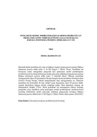 Masalah dalam penelitian ini yaitu rendahnya tingkat penguasaan kosakata Bahasa Indonesia peserta didik kelas V di SD Negeri 1 Metro Timur. Penelitian ini bertujuan untuk mengetahui pengaruh dari penerapan model pembelajaran problem-based learning berbantuan media educandy terhadap penguasaan kosakata Bahasa Indonesia peserta didik kelas V Sekolah Dasar. Metode penelitian menggunakan Quasi Experimental Design dengan desain penelitian Nonequivalent Control Group Design Teknik pengumpulan data menggunakan tes. Populasi penelitian ini berjumlah 49 dan sampel yang digunakan yaitu 49 peserta didik, sampel ditentukan dengan teknik sampling jenuh. Data dianalisis dengan uji Independent Sample T-Test. Hasil penelitian ini menunjukan bahwa terdapat pengaruh yang signifikan pada penerapan model pembelajaran problem-based learning berbantuan media educandy terhadap penguasaan kosakata Bahasa Indonesia peserta didik kelas V SD Negeri 1 Metro Timur tahun ajaran 2024/2025. Kata Kunci: educandy, kosakata, problem-based learning The problem in this study was the low level of Indonesian vocabulary mastery of grade V students at SD Negeri 1 Metro Timur. This study aimed to determine the effect of implementing the Problem-Based Learning model assisted by Educandy media on the vocabulary mastery of Indonesian language in grade V elementary school students. The research method used a Quasi-Experimental Design with a Nonequivalent Control Group Design. The data collection technique used a test. The population of this research consisted of 49 students, and the sample were the same 49 students, selected using a saturated sampling technique. The data was analyzed using the Independent Sample T-Test. The results of the study showed that there was a significant effect of implementing the Problem-Based Learning model assisted by Educandy media on the vocabulary mastery of Indonesian in grade V students at SD Negeri 1 Metro Timur in the 2024/2025 academic year. Keyword: educandy, vocabulary, problem-based learning