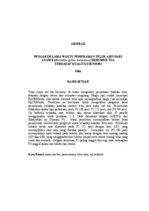 Telur ayam ras tua berumur 28 bulan mengalami penurunan kualitas telur, ditandai dengan warna dan kekuatan cangkang. Harga jual rendah mencapai Rp1000/butir, jika diolah menjadi telur asin meningkatkan harga jual mencapai Rp2500/butir. Penelitian ini bertujuan untuk mengetahui pengaruh lama pemeraman terhadap kualitas sensori telur asin ayam ras tua. Pemeraman dilakukan dalam tiga perlakuan, yaitu P1 (48 jam), P2 (72 jam), dan P3 (96 jam). Uji hedonik terhadap rasa, tekstur, dan warna dilakukan oleh 20 panelis menggunakan skala penilaian 1–5. Data dianalisis dengan ANOVA dan dilanjutkan uji Duncan 5%. Hasil penelitian menunjukkan bahwa lama pemeraman memberikan pengaruh nyata terhadap kualitas telur asin. Perlakuan terbaik untuk rasa diperoleh pada P2 (72 jam) dengan skor 4,05, yang menunjukkan rasa asin yang disukai panelis. Sementara itu, P3 (96 jam) menunjukkan hasil terbaik pada tekstur dan warna dengan skor masing-masing 4,05 dan 4,00, yang menggambarkan tekstur kenyal serta warna kuning telur yang cerah dan menarik. Dengan demikian, P2 paling unggul dari segi rasa, sedangkan P3 unggul dalam hal tekstur dan warna. Kata Kunci: ayam ras tua, pemeraman, telur asin, uji hedonik Eggs of 28-month-old purebred chickens have decreased egg quality, characterized by color and shell strength. The low selling price reaches Rp1000/item; if processed into salted eggs, the selling price increases to Rp2500/item. This study aims to determine the effect of the length of maceration on the sensory quality of salted eggs of old broiler chickens. Brining was carried out in three treatments, namely P1 (48 hours), P2 (72 hours), and P3 (96 hours). Hedonic tests of taste, texture, and color were conducted by 20 panelists using a 1-5 rating scale. Data were analyzed by ANOVA and followed by a 5% Duncan test. The results showed that the length of maceration had a significant effect on the quality of salted eggs. The best treatment for taste was obtained in P2 (72 hours) with a score of 4.05, which showed a salty taste that the panelists liked. Meanwhile, P3 (96 hours) showed the best results in texture and color with scores of 4.05 and 4.00, respectively, which described the chewy texture and bright and attractive yolk color. Thus, P2 was most superior in terms of taste, while P3 excelled in terms of texture and color. Key words: old breed chicken, aging, salted egg, hedonic test