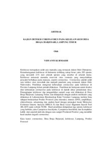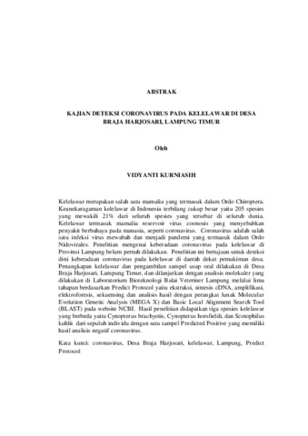 Kelelawar merupakan salah satu mamalia yang termasuk dalam Ordo Chiroptera. Keanekaragaman kelelawar di Indonesia terbilang cukup besar yaitu 205 spesies yang mewakili 21% dari seluruh spesies yang tersebar di seluruh dunia. Kelelawar termasuk mamalia reservoir virus zoonosis yang menyebabkan penyakit berbahaya pada manusia, seperti coronavirus. Coronavirus adalah salah satu infeksi virus mewabah dan menjadi pandemi yang termasuk dalam Ordo Nidovirales. Penelitian mengenai keberadaan coronavirus pada kelelawar di Provinsi Lampung belum pernah dilakukan. Penelitian ini bertujuan untuk deteksi dini keberadaan coronavirus pada kelelawar di daerah dekat pemukiman desa. Penangkapan kelelawar dan pengambilan sampel usap oral dilakukan di Desa Braja Harjosari, Lampung Timur, dan dilanjutkan dengan analisis molekuler yang dilakukan di Laboratorium Bioteknologi Balai Veteriner Lampung melalui lima tahapan berdasarkan Predict Protocol yaitu ekstraksi, sintesis cDNA, amplifikasi, elektroforesis, sekuensing dan analisis hasil dengan perangkat lunak Molecular Evolution Genetic Analysis (MEGA X) dan Basic Local Alignment Search Tool (BLAST) pada website NCBI. Hasil penelitian didapatkan tiga spesies kelelawar yang berbeda yaitu Cynopterus brachyotis, Cynopterus horsfieldi, dan Scotophilus kuhlii dari sepuluh individu dengan satu sampel Predicted Positive yang memiliki hasil analisis negatif coronavirus. Kata kunci: coronavirus, Desa Braja Harjosari, kelelawar, Lampung, Predict Protocol Bats are mammals belonging to the Order Chiroptera. Indonesia has considerable bat diversity with 205 species, representing 21% of all bat species worldwide. Bats serve as reservoir mammals for zoonotic viruses that cause dangerous diseases in humans, such as coronavirus. Coronavirus is an emerging viral infection that has become a pandemic and belongs to the order Nidovirales. No previous research has been conducted on coronavirus presence in bats from Lampung. This study aims to conduct early detection of coronavirus in bats near village settlements. Bat capture and oral swab sampling were performed in Braja Harjosari, East Lampung, followed by molecular analysis at the Biotechnology Laboratory of Lampung Disease Investigation Center through five stages based on Predict Protocol: extraction, cDNA synthesis, amplification, electrophoresis, sequencing, and result analysis using Molecular Evolution Genetic Analysis (MEGA X) software and Basic Local Alignment Search Tool (BLAST) on the NCBI website. The study identified three different bat species (Cynopterus brachyotis, Cynopterus horsfieldii, and Scotophilus kuhlii) from ten individuals, with one Predicted Positive sample showing negative coronavirus analysis results. Keywords: coronavirus, Braja Harjosari, bats, Lampung, Predict Protocol