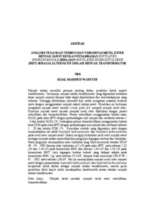 Minyak isolasi memiliki peranan penting dalam peralatan listrik seperti transformator. Umumnya, minyak isolasi transformator yang digunakan berbahan dasar minyak mineral dimana tidak dapat diperbaharui dan kesertiadaannya yang terbatas. Sehingga dibutuhkan alternatif lain untuk mengatasi masalah tersebut yaitu dengan menggunakan minyak nabati kelapa sawit. Penelitian ini bertujuan mengubah minyak sawit mentah (crude palm oil) menjadi minyak metil ester. Konversi minyak sawit mentah menjadi metil ester dilakukan dengan proses esterifikasi dan transesterifikasi. Proses esterifikasi menggunakan katalis asam H2SO4 pada suhu 60°C dengan perbandingan mol minyak dan methanol sebesar 1 : 6 dan katalis H2SO4 1%. Sedangkan proses transesterifikasi menggunakan katalis basa KOH pada suhu 60°C dengan perbandingan mol minyak dan methanol sebesar 1 : 20 dan katalis KOH 1%. Kemudian metode yang digunakan yaitu dengan menambahkan zat aditif butylated hydroxyanisole dan butylated hydroxytoluene pada metil ester minyak sawit. Dalam menguji kelayakan metil ester minyak sawit seebagai minyak isolasi maka dilakukan pengujian tegangan tembus dan viskositas. Hasil pengujian menunjukkan nilai viskositas yang telah memenuhi standar SPLN 49 – 91 : 1982 dimana nilai viskositas ≤12 cSt pada suhu 40°C, yaitu sebesar 5,32 cSt dan 5,44 cSt pada konsentrasi BHA dan sebesar 5,44 cSt dan 5,56 cSt pada konsentrasi BHT. Lalu tegangan tembus terbaik yang didapat adalah pada konsentrasi BHA 5 gr yaitu sebesar 37,4 kV, dimana telah memenuhi SPLN 49 – 91 : 1982 yaitu sebesar ≥30 kV. Hal ini menunjukkan minyak metil ester minyak sawit dengan penambahan butylated hydroxyanisole dan butylated hydroxytoluene berpotensi untuk diolah sebagai minyak isolasi transformator, namun perlu penelitian lebih lanjut untuk mendapatkan karakteristik sesuai standar minyak isolasi transformator. Kata kunci : Minyak sawit mentah, minyak metil ester, esterifikasi, transesterifikasi. The insulating oil has an important role in electrical equipment such as transformers. Generally, the transformer insulating oil used is based on mineral oil which cannot be renewed and its availability is limited. So another alternative is needed to overcome this problem, namely by using palm vegetable oil. This research aims to convert crude palm oil into methyl ester oil. The conversion of crude palm oil into methyl ester is done by esterification and transesterification process. The esterification process uses H2SO4 acid catalyst at 60°C with a mole ratio of oil and methanol of 1: 6 and 1% H2SO4 catalyst. While the transesterification process uses KOH base catalyst at 60°C with a mole ratio of oil and methanol of 1 : 20 and 1% KOH catalyst: 20 and 1% KOH catalyst. Then the method used is by adding butylated hydroxyanisole and butylated hydroxytoluene additives to palm oil methyl esters. In testing the feasibility of palm oil methyl ester as an insulating oil, the breakdown voltage and viscosity were tested. The test results show that the viscosity value meets the SPLN 49-91 standard: 1982 where the viscosity value ≤12 cSt at 40°C, namely 5.32 cSt and 5.44 cSt at BHA concentration and 5.44 cSt and 5.56 cSt at BHT concentration. Then the best breakdown voltage obtained is at a concentration of BHA 5 gr which is 37.4 kV, which has met SPLN 49 - 91: 1982 which is ≥30 kV. This shows that palm oil methyl ester oil with the addition of butylated hydroxyanisole and butylated hydroxytoluene has the potential to be processed as transformer insulation oil, but further research is needed to obtain characteristics according to transformer insulation oil standards. Keyword : Crude palm oil, methyl ester oil, esterification, transesterification.