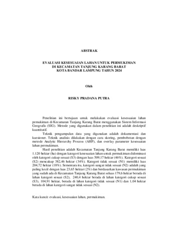 Penelitian ini bertujuan untuk melakukan evaluasi kesesuaian lahan pemukiman di Kecamatan Tanjung Karang Barat menggunakan Sistem Informasi Geografis (SIG). Metode yang digunakan dalam penelitian ini adalah deskriptif kuantitatif. Teknik pengumpulan data yang digunakan adalah dokumentasi dan kuesioner. Teknik analisis dilakukan dengan cara skoring, pembobotan dengan metode Analytic Hierarchy Process (AHP), dan overlay parameter kesesuaian lahan permukiman. Hasil penelitian adalah Kecamatan Tanjung Karang Barat memiliki luas 1.120 hektar (ha) dengan kategori kesesuaian lahan untuk permukiman didominasi oleh kategori cukup sesuai (S3) dengan luas 509,17 hektar (46%). Kategori sesuai (S2) mencakup 382,46 hektar (34%). Kategori tidak sesuai (N1) memiliki luas 204,72 hektar (18%). Sementara itu, kategori sangat tidak sesuai (N2) adalah yang paling kecil dengan luas 23,65 hektar (2%) dan berdasarkan kawasan permukiman yang sudah ada di Kecamatan Tanjung Karang Barat seluas 179,6 hektar berada di lahan kategori sesuai (S2), 240,4 hektar berada di lahan kategori cukup sesuai (S3), 104,91 hektar, berada di lahan kategori tidak sesuai (N1) dan 1,04 hektar berada di lahan kategori sangat tidak sesuai (N2). Kata kunci: evaluasi, kesesuaian lahan, permukiman. This research aims to evaluate the suitability of residential land in Tanjung Karang Barat Sub-district using Geographic Information System (GIS). The method used in this research is descriptive quantitative. The data collection techniques used were documentation and questionnaires. The analysis technique was carried out by scoring, weighting with the Analytic Hierarchy Process (AHP) method, and overlaying settlement land suitability parameters. The result of the research is that Tanjung Karang Barat Sub-district has an area of 1,120 hectares (ha) with the land suitability category for settlements dominated by the moderately suitable category (S3) with an area of 509.17 hectares (46%). The suitable category (S2) covers 382.46 hectares (34%). The unsuitable category (N1) covers 204.72 hectares (18%). Meanwhile, the highly unsuitable category (N2) is the smallest with an area of 23.65 hectares (2%) and based on the existing residential area in Tanjung Karang Barat Sub-district, 179.6 hectares are in the suitable land category (S2), 240.4 hectares are in the moderately suitable land category (S3), 104.91 hectares, are in the unsuitable land category (N1) and 1.04 hectares are in the highly unsuitable land category (N2). Keywords: evaluation, land suitability, settlement.