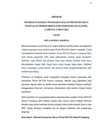 ARYA , KURNIA MAHESA (2025) PENERAPAN BAURAN PEMASARAN DALAM MENINGKATKAN PENJUALAN PRODUK BERAS PADA PERUM BULOG KANWIL LAMPUNG TAHUN 2022. [Diploma/Tugas Akhir]
