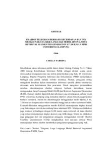 Keterbukaan akses informasi publik diatur dalam Undang-Undang No 14 Tahun 2008 tentang Keterbukaan Informasi Publik sebagai elemen utama untuk mewujudkan transparansi dan tata kelola pemerintahan yang baik. Di Universitas Lampung, Pejabat Pengelola Informasi dan Dokumentasi (PPID) menyediakan berbagai data publik melalui website resminya. Namun, pengguna sering mengalami kesulitan dalam menemukan informasi spesifik akibat tersebarnya dokumen serta keterbatasan fitur pencarian. Untuk mengatasi permasalahan tersebut, dikembangkan chatbot telegram berbasis kecerdasan buatan menggunakan Large Language Model (LLM) dan Retrieval Augmented Generation (RAG). Dataset chatbot diperoleh dari informasi yang tersedia pada website resmi PPID Universitas Lampung yang kemudian diproses untuk mendukung pencarian berbasis semantik. Sistem ini dikembangkan menggunakan model Qwen2.5 VL 72B Instruct dan pencarian vektor semantik menggunakan vektor database FAISS. Evaluasi dilakukan menggunakan matriks RAGAS menunjukkan tingkat akurasi yang baik dengan skor di atas ambang batas minimum 80%. Selanjutnya dilakukan juga evaluasi perbadingan dengan LLM murni tanpa retrieval, di mana chatbot yang dibuat menunjukkan tingkat akurasi yang lebih tinggi. Selain itu, dilakukan juga pengujian dari sisi pengalaman pengguna menggunakan metode Chatbot Usability Questionnaire (CUQ) menghasilkan skor rata-rata sebesar 90,62 menunjukkan bahwa chatbot memberikan pengalaman penggunaan yang baik. Kata kunci: Chatbot, Telegram, Large Language Model, Retrieval Augmented Generation, FAISS, Qwen. Public access to information is regulated under Law No. 14 of 2008 concerning Keterbukaan Informasi Publik (UU KIP) as a key element in promoting transparency and good governance. At the University of Lampung, Pejabat Pengelola Informasi dan Dokumentasi (PPID) provides various public data through its official website. However, users often face difficulties in finding specific information due to scattered documents and limited search features. To address this issue, a Telegram chatbot powered by artificial intelligence was developed using a Large Language Model (LLM) and Retrieval Augmented Generation (RAG). The chatbot dataset was obtained from the official PPID Universitas Lampung website and was further processed to support semantic-based search. The system was developed using the Qwen2.5 VL 72B Instruct model, with semantic vector search performed using the FAISS vector database. Evaluation using the RAGAS metrics showed good accuracy levels, with scores exceeding the minimum threshold of 80%. A comparative evaluation with a pure LLM (without retrieval) was also conducted, in which the developed chatbot demonstrated higher accuracy. In addition, user experience testing was carried out using the Chatbot Usability Questionnaire (CUQ), yielding an average score of 90.62, indicating that the chatbot provides a good user experience. Keywords: Chatbot, Telegram, Large Language Model, Retrieval Augmented Generation, FAISS, Qwen