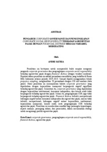 Penelitian ini bertujuan untuk memperoleh bukti empiris mengenai pengaruh corporate governance dan pengungkapan corporate social responsibility terhadap agresivitas pajak dengan financial distress sebagai variabel moderasi. Populasi dalam penelitian ini adalah perusahaan manufaktur yang terdaftar di Bursa Efek Indonesia selama periode 2019-2023. Sampel dipilih menggunakan teknik purposive sampling, menghasilkan 70 perusahaan dengan 350 unit analisis (data panel). Hasil penelitian ini menunjukkan bahwa corporate governance yang diproksikan dengan kepemilikan manajerial berpengaruh negatif signifikan terhadap agresivitas pajak. Sementara itu, corporate governance yang diproksikan dengan kepemilikan institusional, komisaris independen, dan komite audit tidak berpengaruh terhadap agresivitas pajak. Selain itu, pengungkapan CSR juga tidak berpengaruh terhadap agresivitas pajak. Financial distress terbukti memperlemah hubungan negatif antara komisaris independen dan agresivitas pajak, namun tidak terbukti memperlemah hubungan negatif antara kepemilikan institusional, kepemilikan manajerial, komite audit, serta pengungkapan CSR terhadap agresivitas pajak. Penelitian ini memberikan manfaat bagi pemangku kepentingan, seperti manajer, pemegang saham, dan pemerintah, dalam merumuskan strategi untuk mengurangi praktik agresivitas pajak. Kata Kunci: corporate governance, pengungkapan corporate social responsibility, financial distress, agresivitas pajak This study aims to obtain empirical evidence regarding the effect of corporate governance and corporate social responsibility disclosure on tax aggressiveness with financial distress as a moderating variable. The population in this study was manufacturing companies listed on the Indonesia Stock Exchange during the period 2019-2023. The sample was selected using a purposive sampling technique, resulting in 70 companies with 350 analysis units (panel data). The results of this study indicate that corporate governance proxied by managerial ownership has a significant negative effect on tax aggressiveness. Meanwhile, corporate governance proxied by institutional ownership, independent commissioners, and audit committees has no effect on tax aggressiveness. In addition, CSR disclosure also has no effect on tax aggressiveness. Financial distress is proven weaken the negative relationship between independent commissioners and tax aggressiveness, but is not proven to weaken the negative relationship between institutional ownership, managerial ownership, audit commitees, and CSR disclosure on tax aggressiveness. This study is provides for stakeholders, such as managers, shareholders, and the government in developing strategies to reduce tax aggressiveness practices. Keywords: corporate governance, corporate social responsibility disclosure, financial distress, tax aggressiveness