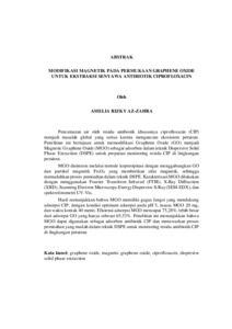 Pencemaran air oleh residu antibiotik khususnya ciprofloxacin (CIP) menjadi masalah global yang serius karena mengancam ekosistem perairan. Penelitian ini bertujuan untuk memodifikasi Graphene Oxide (GO) menjadi Magnetic Graphene Oxide (MGO) sebagai adsorben dalam teknik Dispersive Solid Phase Extraction (DSPE) untuk preparasi monitoring residu CIP di lingkungan perairan. MGO disintesis melalui metode kopresipitasi dengan menggabungkan GO dan partikel magnetik Fe3O4 yang memberikan sifat magnetik, sehingga memudahkan proses pemisahan dalam teknik DSPE. Karakterisasi MGO dilakukan dengan menggunakan Fourier Transform Infrared (FTIR), X-Ray Diffraction (XRD), Scanning Electron Microscopy-Energy Dispersive X-Ray (SEM-EDX), dan spektrofotometri UV-Vis. Hasil menunjukkan bahwa MGO memiliki gugus fungsi yang mendukung adsorpsi CIP, dengan kondisi optimum adsorpsi pada pH 5, massa MGO 20 mg, dan waktu kontak 40 menit. Efisiensi adsorpsi MGO mencapai 75,28%, lebih besar dari adsorpsi GO yang hanya sebesar 65,53%. Penelitian ini menunjukkan bahwa MGO dapat digunakan sebagai adsorben antibiotik CIP dan menawarkan proses pemisahan yang mudah dalam teknik DSPE untuk monitoring residu antibiotik CIP di lingkungan perairan. Kata kunci: graphene oxide, magnetic graphene oxide, ciprofloxacin, dispersive solid phase extraction ABSTRACT MAGNETIC MODIFICATION ON GRAPHENE OXIDE SURFACE FOR EXTRACTION OF ANTIBIOTIC COMPOUND CIPROFLOXACIN By AMELIA RIZKY AZ-ZAHRA Water pollution caused by antibiotic residues, particularly ciprofloxacin (CIP), has become a serious global issue as it threatens aquatic ecosystems. This study aims to modify Graphene Oxide (GO) into Magnetic Graphene Oxide (MGO) to be used as an adsorbent in the Dispersive Solid Phase Extraction (DSPE) technique for the preparation and monitoring of CIP residues in aquatic environments. MGO was synthesized via the coprecipitation method by combining GO with magnetic Fe3O4 particles, which impart magnetic properties and facilitate the separation process in DSPE. The characterization of MGO was carried out using Fourier Transform Infrared Spectroscopy (FTIR), X-Ray Diffraction (XRD), Scanning Electron Microscopy-Energy Dispersive X-Ray (SEM-EDX), and UV-Vis spectrophotometry. The results showed that MGO possesses functional groups that support CIP adsorption, with optimal adsorption conditions at pH 5, an MGO mass of 20 mg, and a contact time of 40 minutes. The adsorption efficiency of MGO reached 75.28%, which is higher than that of GO at only 65.53%. This study demonstrates that MGO can be used as an adsorbent for CIP antibiotics and offers an easy separation process in the DSPE technique for monitoring CIP antibiotic residues in aquatic environments. Keywords: graphene oxide, magnetic graphene oxide, ciprofloxacin, dispersive solid phase extraction