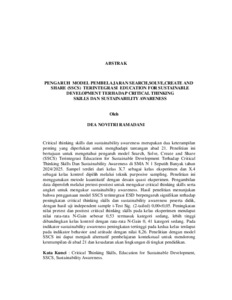 DEA NOVITRI , RAMADANI (2025) PENGARUH MODEL PEMBELAJARAN SEARCH,SOLVE,CREATE AND SHARE (SSCS) TERINTEGRASI EDUCATION FOR SUSTAINABLE DEVELOPMENT TERHADAP CRITICAL THINKING SKILLS DAN SUSTAINABILITY AWARENESS. FAKULTAS KEGURUAN DAN ILMU PENDIDIKAN, UNIVERSITAS LAMPUNG.