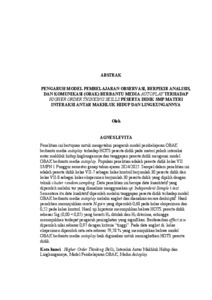 Penelitian ini bertujuan untuk mengetahui pengaruh model pembelajaran OBAK berbantu media autoplay terhadap HOTS peserta didik pada materi pokok interaksi antar makhluk hidup lingkungannya dan tanggapan peserta didik mengenai model OBAK berbantu media autoplay. Populasi penelitian adalah peserta didik kelas VII SMPN 1 Punggur semester genap tahun ajaran 2024/2025. Sampel dalam penelitian ini adalah peserta didik kelas VII-7 sebagai kelas kontrol berjumlah 30 peserta didik dan kelas VII-8 sebagai kelas eksperimen berjumlah 30 peserta didik yang dipilih dengan teknik cluster random sampling. Data penelitian ini berupa data kuantitatif yang diperoleh melalui tes yang dianalisis menggunakan uji Independent Sample t-test. Sementara itu data kualitatif diperoleh melalui tanggapan peserta didik terhadap model OBAK berbantu media autoplay melalui angket dan dianalisis secara deskriptif. Hasil penelitian menunjukkan rerata N-gain yang diperoleh 0,68 pada kelas eksperimen dan 0,52 pada kelas kontrol. Hasil uji hipotesis menunjukkan bahwa HOTS peserta didik sebesar Sig.(0,00 < 0,05) yang berarti Ho ditolak dan H1 diterima, sehingga menunjukkan terdapat pengaruh peningkatan yang signifikan. Berdasarkan effect size diperoleh nilai sebesar 0,97 dengan kriteria “tinggi”. Pada data angket di kelas eksperimen diperoleh rata-rata sebesar 79,58 % yang menunjukkan bahwa model OBAK berbantu media autoplay baik digunakan untuk meningkatkan HOTS peserta didik. Kata kunci : Higher Order Thinking Skills, Interaksi Antar Makhluk Hidup dan Lingkungannya, Model Pembelajaran OBAK, Media Autoplay. iii ABSTRACT THE EFFECT OF OBSERVATION, ANALYTICAL THINKING, AND COMMUNICATION (OBAK) LEARNING MODEL USING AUTOPLAY MEDIA ON THE HIGHER ORDER THINKING SKILLS OF JUNIOR HIGH SCHOOL STUDENTS ON THE MATERIAL OF INTERACTION BETWEEN LIVING This study aims to determine the effect of the OBAK learning model assisted by autoplay media on students' HOTS on the main material of interaction between living things and their environment and students' responses to the OBAK model assisted by autoplay media. The population of the study was students of class VII of SMPN 1 Punggur in the even semester of the 2024/2025 academic year. The sample in this study was students of class VII-7 as the control class totaling 30 students and class VII-8 as the experimental class totaling 30 students selected using the cluster random sampling technique. The research data is in the form of quantitative data obtained through tests analyzed using the Independent Sample t-test. Meanwhile, qualitative data was obtained through student responses to the OBAK model assisted by autoplay media through a questionnaire and analyzed descriptively. The results of the study showed that the average N-gain obtained was 0.68 in the experimental class and 0.52 in the control class. The results of the hypothesis test showed that the HOTS of students was Sig. (0.00 <0.05) which means that Ho is rejected and H1 is accepted, thus indicating that there is a significant increase. Based on the effect size, a value of 0.97 was obtained with the criteria of "high". In the questionnaire data in the experimental class, an average of 79.58% was obtained, indicating that the OBAK model assisted by autoplay media is good for improving students' HOTS. Keywords: Higher Order Thinking Skills, Interactions Between Living Things and Their Environment, OBAK Learning Model, Autoplay Media.