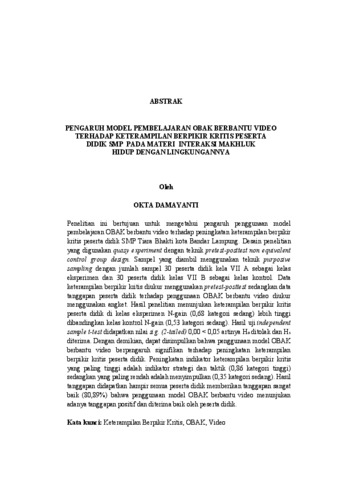 Okta Damayanti, - (2025) PENGARUH MODEL PEMBELAJARAN OBAK BERBANTU VIDEO TERHADAP KETERAMPILAN BERPIKIR KRITIS PESERTA DIDIK SMP PADA MATERI INTERAKSI MAKHLUK HIDUP DENGAN LINGKUNGANNYA. FAKULTAS KEGURUAN DAN ILMU PENDIDIKAN, UNIVERSITAS LAMPUNG.