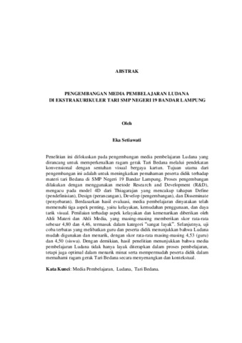 Penelitian ini difokuskan pada pengembangan media pembelajaran Ludana yang dirancang untuk memperkenalkan ragam gerak Tari Bedana melalui pendekatan konvensional dengan sentuhan visual bergaya kartun. Tujuan utama dari pengembangan ini adalah untuk meningkatkan pemahaman peserta didik terhadap materi tari Bedana di SMP Negeri 19 Bandar Lampung. Proses pengembangan dilakukan dengan menggunakan metode Research and Development (R&D), mengacu pada model 4D dari Thiagarajan yang mencakup tahapan Define (pendefinisian), Design (perancangan), Develop (pengembangan), dan Disseminate (penyebaran). Berdasarkan hasil evaluasi, media pembelajaran dinyatakan telah memenuhi tiga aspek penting, yaitu kelayakan, kemudahan penggunaan, dan daya tarik visual. Penilaian terhadap aspek kelayakan dan kemenarikan diberikan oleh Ahli Materi dan Ahli Media, yang masing-masing memberikan skor rata-rata sebesar 4,80 dan 4,46, termasuk dalam kategori “sangat layak”. Selanjutnya, uji coba terbatas yang melibatkan guru dan peserta didik menunjukkan bahwa Ludana mudah digunakan dan menarik, dengan skor rata-rata masing-masing 4,53 (guru) dan 4,50 (siswa). Dengan demikian, hasil penelitian menunjukkan bahwa media pembelajaran Ludana tidak hanya layak diterapkan dalam proses pembelajaran, tetapi juga optimal dalam menarik minat serta mempermudah peserta didik dalam memahami ragam gerak Tari Bedana secara menyenangkan dan kontekstual. Kata Kunci: Media Pembelajaran, Ludana, Tari Bedana. This research was focused on the development of Ludana as an instructional medium designed to introduce the movement variations of Tari Bedana through a conventional approach enhanced with cartoon-style visuals. The primary goal of this development was to improve students’ understanding of Tari Bedana at SMP Negeri 19 Bandar Lampung. The development process was carried out using the Research and Development (R&D) method, based on the 4D model proposed by Thiagarajan, which consists of four stages: Define, Design, Develop, and Disseminate. The results obtained from the evaluation revealed that the Ludana learning media met three essential criteria: feasibility, ease of use, and visual appeal. The feasibility and attractiveness of the media were assessed by a Subject Matter Expert and a Media Expert, who provided average scores of 4.80 and 4.46 respectively, both categorized as “highly feasible.” In addition, limited trials involving teachers and students were conducted, in which the media received average scores of 4.53 from teachers and 4.50 from students, indicating that the product was considered easy to use and engaging. Based on the findings, Ludana was deemed not only appropriate for implementation in the learning process, but also effective in enhancing students’ interest and facilitating their understanding of Tari Bedana movements in an enjoyable and contextually relevant manner. Keywords: Learning Media, Ludana, Bedana Dance.