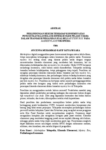 Avicenna , Muhammad Rafif Satyaneg (2025) PERLINDUNGAN HUKUM TERHADAP KONSUMEN ATAS PENGGUNAAN KLAUSULA EKSONERASI OLEH PELAKU USAHA DALAM TRANSAKSI PERJANJIAN JUAL BELI MYSTERY BOX PADA MARKETPLACE TOKOPEDIA. HUKUM, UNIVERSITAS LAMPUNG.