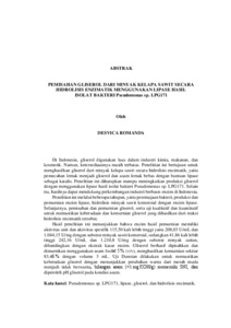 Di Indonesia, gliserol digunakan luas dalam industri kimia, makanan, dan kosmetik. Namun, ketersediaannya masih terbatas. Penelitian ini bertujuan untuk menghasilkan gliserol dari minyak kelapa sawit secara hidrolisis enzimatik, yaitu pemecahan lemak menjadi gliserol dan asam lemak bebas dengan bantuan lipase sebagai katalis. Penelitian ini diharapkan mampu meningkatkan produksi gliserol dengan menggunakan lipase hasil isolat bakteri Pseudomonas sp. LPG171. Selain itu, hasilnya dapat mendukung perkembangan industri berbasis enzim di Indonesia. Penelitian ini melalui beberapa tahapan, yaitu peremajaan bakteri, produksi dan pemurnian enzim lipase, hidrolisis minyak sawit komersial dengan enzim lipase. Selanjutnya, pemisahan dan pemurnian gliserol, serta uji kualitatif dan kuantitatif untuk memastikan keberadaan dan kemurnian gliserol yang dihasilkan dari reaksi hidrolisis enzimatik tersebut. Hasil penelitian ini menunjukkan bahwa enzim hasil pemurnian memiliki aktivitas unit dan aktivitas spesifik 115,50 kali lebih tinggi yaitu 208,03 U/mL dan 1.044,15 U/mg dengan substrat minyak sawit komersial, sedangkan 41,86 kali lebih tinggi 242,16 U/mL dan 1.210,8 U/mg dengan substrat minyak zaitun, dibandingkan dengan ekstrak kasar enzim. Gliserol berhasil dipisahkan dan dimurnikan menggunakan asam fosfat 5 % (v/v), menghasilkan kemurnian sekitar 83,46 % dengan volume 3 mL. Uji Dunstan dilakukan untuk memastikan keberadaan gliserol dengan menunjukkan perubahan warna dari merah muda menjadi tidak berwarna, bilangan asam (<1 mg KOH/g) memenuhi SNI, dan diperoleh pH gliserol pada kondisi asam. Kata kunci: Pseudomonas sp. LPG171, lipase, gliserol, dan hidrolisis enzimatik. In Indonesia, glycerol is widely used in the chemical, food, and cosmetic industries. However, its availability remains limited. This study aims to produce glycerol from palm oil through enzymatic hydrolysis, which involves the breakdown of fats into glycerol and free fatty acids with the aid of lipase as a catalyst. The study is expected to increase glycerol production using lipase derived from a bacterial isolate, Pseudomonas sp. LPG171. Additionally, the results may support the development of enzyme-based industries in Indonesia. The research involved several stages, including bacterial rejuvenation, production and purification of lipase enzyme, hydrolysis of commercial palm oil using the purified lipase, followed by separation and purification of glycerol. Qualitative and quantitative tests were carried out to confirm the presence and purity of glycerol produced from the enzymatic hydrolysis reaction. The results showed that the purified enzyme had 115.50 times higher activity and specific activity 208.03 U/mL and 1,044.15 U/mg respectively when using commercial palm oil as substrate, and 41.86 times higher 242.16 U/mL and 1,210.8 U/mg when using olive oil, compared to crude enzyme extract. Glycerol was successfully separated and purified using 5% (v/v) phosphoric acid, resulting in approximately 83,46% purity and a final volume of 3 mL. The Dunstan test confirmed the presence of glycerol by showing a color change from pink to colorless. The acid value (<1 mg KOH/g) met the Indonesian National Standard (SNI), and the glycerol had an acidic pH. Keywords: Pseudomonas sp. LPG171, lipase, glycerol, enzymatic hydrolysis.