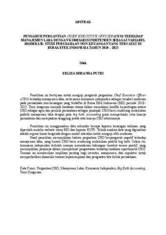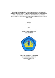 Erliza , Miranda Putri (2025) PENGARUH PERGANTIAN CHIEF EXECUTIVE OFFICER (CEO) TERHADAP MANAJEMEN LABA DENGAN KOMISARIS INDEPENDEN SEBAGAI VARIABEL MODERASI: STUDI PERUSAHAAN NON-KEUANGAN YANG TERCATAT DI BURSA EFEK INDONESIA TAHUN 2018 – 2023. FAKULTAS EKONOMI DAN BISNIS , UNIVERSITAS LAMPUNG .