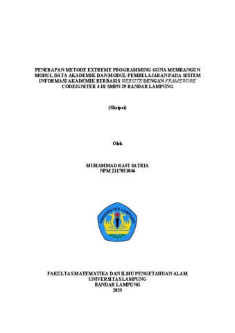 Muhammad , Rafi Satria (2025) PENERAPAN METODE EXTREME PROGRAMMING GUNA MEMBANGUN MODUL DATA AKADEMIK DAN MODUL PEMBELAJARAN PADA SISTEM INFORMASI AKADEMIK BERBASIS WEBSITE DENGAN FRAMEWORK CODEIGNITER 4 DI SMPN 29 BANDAR LAMPUNG. FAKULTAS MATEMATIKA DAN ILMU PENGETAHUAN ALAM, UNIVERSITAS LAMPUNG.