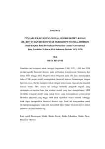 ABSTRAK Penelitian ini bertujuan untuk menguji bagaimana CAR, NPL, LDR dan NIM mempengaruhi financial distress pada perbankan konvensional Indonesia dari tahun 2021 hingga 2023. Regresi linear berganda pada 111 data menunjukkan bahwa CAR secara positif meningkatkan financial distress, bertentangan dengan hipotesis awal. Hal ini mungkin terkait dengan penyesuaian regulasi dan masalah alokasi modal. NPL secara tak terduga memiliki pengaruh negatif, yang menunjukkan regulasi baru dan struktur modal yang kuat mengimbangi. LDR memiliki pengaruh positif yang cukup besar, yang menunjukkan kekhawatiran likuiditas pinjaman yang tinggi. NIM tidak signifikan secara statistik, sehingga tidak dapat memprediksi financial distress saja. Studi ini menyarankan untuk memperpanjang jangka waktu dan menambah faktor-faktor ekonomi makro dalam penelitian di masa mendatang. Kata kunci: Kecukupan Modal, Risiko Kredit, Risiko Likuiditas, Risiko Pasar, Financial Distress This research examined how CAR, NPL, LDR, and NIM effect financial hardship in Indonesian conventional banks from 2021 to 2023. Multiple regression on 111 data showed CAR positively increased financial hardship, contradicting the original prediction. This may be related to regulatory adjustments and capital allocation issues. NPL unexpectedly had a negative effect, indicating new laws and rabust capital structures offset it. LDR had a considerable positive effect, suggesting high lending liquidity concerns. NIM was not statistically significant, hence it cannot predict distress alone. The study suggests extending the timeframe and integrating macroeconomic factors in future research. Keywords: Capital Adequacy, Credit Risk, Liquidity Risk, Market Risk, Financial Distress