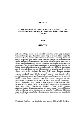 Indonesia sebagai negara tropis memiliki kekayaan hayati yang melimpah, termasuk berbagai jenis tumbuhan herbal yang berpotensi dalam pengobatan tradisional. Namun, klasifikasi tumbuhan herbal berdasarkan morfologi daun masih banyak bergantung pada metode visual tradisional yang rentan kesalahan akibat keterbatasan pengetahuan dan kemiripan bentuk daun antarspesies. Penelitian ini menerapkan pendekatan deep learning dengan membandingkan kinerja arsitektur MobileNetV2 dan ResNet50 dalam klasifikasi citra daun herbal sebagai solusi atas keterbatasan tersebut. Dataset yang digunakan terdiri dari 3000 citra daun tunggal dari 10 jenis tumbuhan herbal yang dikelompokkan ke dalam dua bentuk morfologi utama, yaitu cordate (jantung) dan ovate (bulat telur). Tahapan penelitian mencakup pengumpulan data, preprocessing (resize, normalisasi, dan pembagian dataset), pelatihan model dengan transfer learning, serta evaluasi kinerja menggunakan confusion matrix. Hasil menunjukkan bahwa MobileNetV2 memiliki kinerja terbaik dalam klasifikasi citra daun herbal, sedangkan ResNet50 memerlukan penyesuaian untuk mencapai hasil yang optimal. MobileNetV2 memperoleh akurasi tertinggi sebesar 99,33%, sementara ResNet50 mencapai 99% pada skenario terbaiknya. Selain itu, MobileNetV2 menunjukkan waktu pelatihan yang lebih efisien dibandingkan ResNet50. Kedua model kemudian diimplementasikan dalam bentuk aplikasi web menggunakan framework Streamlit untuk mendukung proses klasifikasi secara otomatis. Penelitian ini diharapkan dapat mendorong pemanfaatan teknologi dalam pelestarian dan pemanfaatan tumbuhan herbal. Kata kunci: klasifikasi citra, daun herbal, deep learning, MobileNetV2, ResNet50. Indonesia, as a tropical country, possesses abundant biodiversity, including various types of herbal plants with great potential in traditional medicine. However, the classification of herbal plants based on leaf morphology still largely relies on traditional visual methods, which are prone to errors due to limited expertise and morphological similarities among species. This study applies a deep learning approach by comparing the performance of the MobileNetV2 and ResNet50 architectures in classifying images of herbal leaves as a solution to these limitations. The dataset used consists of 3,000 single-leaf images from 10 types of herbal plants, grouped into two main morphological shapes: cordate (heart- shaped) and ovate (egg-shaped). The research stages include data collection, preprocessing (resizing, normalization, and dataset splitting), model training using transfer learning, and performance evaluation using a confusion matrix. The results show that MobileNetV2 outperforms ResNet50 in classifying herbal leaf images. MobileNetV2 achieved the highest accuracy of 99.33%, while ResNet50 reached 99% in its best-performing scenario. In addition, MobileNetV2 demonstrated more efficient training time compared to ResNet50. Both models were subsequently implemented in a web-based application using the Streamlit framework to support automatic classification. This research is expected to encourage the use of technology in the preservation and utilization of herbal plants. Keywords: image classification, herbal leaves, deep learning, MobileNetV2, ResNet50.