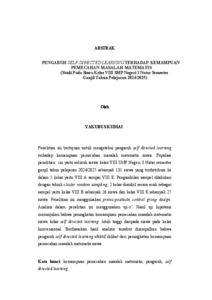 ABSTRAK Penelitian ini bertujuan untuk mengetahui pengaruh self directed learning terhadap kemampuan pemecahan masalah matematis siswa. Populasi penelitian ini yaitu seluruh siswa kelas VIII SMP Negeri 3 Natar semester ganjil tahun pelajaran 2024/2025 sebanyak 131 siswa yang terdistribusi ke dalam 5 kelas yaitu VIII A sampai VIII E. Pengambilan sampel dilakukan dengan teknik cluster random sampling, 2 kelas diambil secara acak sebagai sampel yaitu kelas VIII B sebanyak 26 siswa dan kelas VIII E sebanyak 25 siswa. Penelitian ini menggunakan pretes-posttestn control group design. Analisis dalam penelitian ini menggunakan uji-t’. Hasil uji hipotesis menunjukan bahwa peningkatan kemampuan pemecahan masalah matematis siswa kelas self directed learning lebih tinggi daripada siswa pada kelas konvensional. Berdasarkan hasil analisis tersebut disimpulkan bahwa pengaruh self directed learning efektif dilihat dari peningkatan kemampuan pemecahan masalah matematis siswa. Kata kunci: kemampuan pemecahan masalah matematis, pengaruh, self directed learning This study aims to determine the effect of self-directed learning on students' mathematical problem- solving abilities. The study population consisted of all 131 eighth-grade students of SMP Negeri 3 Natar in the odd semester of the 2024/2025 academic year, distributed into five classes: VIII A to VIII E. Sampling was conducted using a cluster random sampling technique, with two classes randomly selected: class VIII B (26 students) and class VIII E (25 students). This study used a pretest-posttest control group design. The analysis used the χ-test. The results of the hypothesis test showed that students in the self-directed learning class improved their mathematical problem-solving abilities significantly compared to those in the conventional class. Based on this analysis, it was concluded that the effect of self-directed learning was effective, as seen from the improvement in students' mathematical problem- solving abilities. Keywords: mathematical problem solving ability, influence, self-directed learning