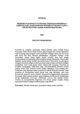 Nur , Suci Romadhona (2025) REPRESENTASI BUDAYA PATRIARKI TERHADAP PEREMPUAN LAMPUNG PADA NASKAH DRAMA PEREMPUAN PILIHAN KARYA ISWADI PRATAMA (Analisis Semiotik Roland Barthes). FAKULTAS ILMU SOSIAL DAN ILMU POLITIK , UNIVERSITAS LAMPUNG .