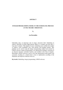 Scheduling plays an important role in today’s education field. Scheduling in schools, especially in Senior High Schools (SMA) is a complex task that takes a long time to prepare. This happens because scheduling must combine the number of subjects, room availability, days, time periods, and teaching teachers. This problem can be solved using the integer programming method and assisted by LINGO software. Integer programming is an optimization technique consisting of an objective function, constraint function, and variables in the form of integers. Meanwhile, LINGO software is used to solve this optimization model quickly and accurately, resulting in a solution that is close to optimization according to the limitations and objectives that have been set. Keywords: Scheduling, integer programming, LINGO software. Penjadwalan memainkan peran penting dalam bidang pendidikan saat ini. Penjadwalan di sekolah, khususnya di Sekolah Menengah Atas (SMA) merupakan tugas kompleks yang membutuhkan waktu yang cukup lama dalam penyusunannya. Hal ini terjadi karena dalam penjadwalan harus mengombinasikan antara banyaknya mata pelajaran, ketersediaan ruangan, hari, periode waktu, dan guru mengajar. Permasalahan tersebut dapat diselesaikan dengan menggunakan metode integer programming dan dibantu software LINGO. Integer programming merupakan teknik optimasi yang terdiri dari fungsi tujuan, fungsi kendala, dan variabel yang berupa bilangan bulat. Sedangkan software LINGO digunakan untuk menyelesaikan model optimasi ini secara cepat dan akurat, sehingga menghasilkan solusi yang mendekati optimasi sesuai dengan batasan dan tujuan yang telah ditetapkan. Kata kunci: Penjadwalan, integer programming, software LINGO.
