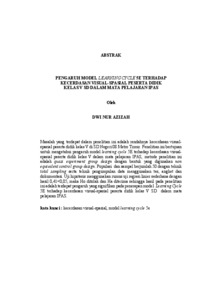 Masalah yang terdapat dalam penelitian ini adalah rendahnya kecerdasan visual- spasial peserta didik kelas V di SD Negeri 08 Metro Timur. Penelitian ini bertujuan untuk mengetahui pengaruh model learning cycle 5E terhadap kecerdasan visual- spasial peserta didik kelas V dalam mata pelajaran IPAS, metode penelitian ini adalah quasi experiment group design dengan bentuk yang digunakan non equivalent control group design. Populasi dan sampel berjumlah 50 dengan teknik total sampling serta teknik pengumpulan data menggunakan tes, angket dan dokumentasi. Uji hipotesis menggunakan rumus uji regresi linier sederhana dengan hasil 0,41<0,05, maka Ho ditolak dan Ha diterima sehingga hasil pada penelitian ini adalah terdapat pengaruh yang signifikan pada penerapan model Learning Cycle 5E terhadap kecerdasan visual-spasial peserta didik kelas V SD dalam mata pelajaran IPAS. kata kunci : kecerdasan visual-spasial, model learning cycle 5e The problem in this study was the low visual-spatial intelligence of fifth-grade students at SD Negeri 08 Metro Timur. This study aimed to determine the effect of the 5E Learning Cycle model on the visual-spatial intelligence of fifth-grade students in the IPAS subject. The research method used was a quasi-experimental group design, specifically a non-equivalent control group design. The population consisted of 50 students, with the sampling technique being total sampling. Data collection techniques included tests, questionnaires, and documentation. The hypothesis was tested using a simple linear regression formula, which resulted in 0.41 < 0.05, thus Ho was rejected and Ha was accepted. Therefore, the result of this study was that there was a significant effect of the 5E Learning Cycle model on the visual-spatial intelligence of fifth-grade students in the IPAS subject at SD Negeri 08 Metro Timur. keywords: 5e learning cycle model, visual-spatial intelligence