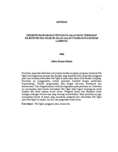 Penelitian yang telah dilakukan ini bertujuan hendak mengkaji mengenai eksistensi Pak Ogah serta bagaimana persepsi dan dampak yang dirasakan oleh masyarakat pengguna jalan raya terhadap keberadaan Pak Ogah di jalan-jalan utama Kota Bandar Lampung. Penelitian ini menggunakan metode penelitian kualitatif dengan pendekatan fenomenologi. Metode pengumpulan data dengan obervasi, wawancara dan dokumentasi. Teori fungsionalisme struktural digunakan pada penelitian ini. Penelitian ini menunjukan hasil bahwa keberadaan Pak Ogah tidak begitu berpengaruh untuk keadaan lalu lintas jalanan secara umum. Pengaruh hanya bisa dirasakan untuk kalangan-kalangan tertentu saja yang memang membutuhkan. Hasil penelitian ini juga menunjukan bahwa di antara yang merasakan pengaruh dari keberadaan Pak Ogah yaitu Pak Ogah itu sendiri, ibu-ibu, dan pengendara mobil besar. Kata kunci : Pak Ogah, pengguna jalan, kemacetan The research that has been conducted aims to examine the existence of Mr. Ogah and how the perceptions and impacts felt by road users on the existence of Mr. Ogah on the main roads of Bandar Lampung City. This research uses a qualitative research method with a phenomenological approach. Data collection methods were observation, interview and documentation. Structural functionalism theory was used in this research. This research shows the result that the existence of Mr. Ogah is not so influential for the state of street traffic in general. The influence can only be felt for certain circles who really need it. The results of this study also show that among those who feel the influence of Pak Ogah's existence are Pak Ogah himself, mothers, and drivers of large cars. Keywords: Mr. Ogah, road users, congestion