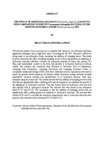 Melly Triana , Eryesma Anwar (2025) PENGARUH PENAMBAHAN DAUN KE TAPANG (Terminalia catappa L.) PADA KOMPOSISI PAKAN UNTUK MENCEGAH BAKTERI Aeromonas hydrophila PADA PERTUMBUHAN BENIH LELE DUMBO (Clarias gariepinus). Masters thesis, UNIVERSITAS LAMPUNG .