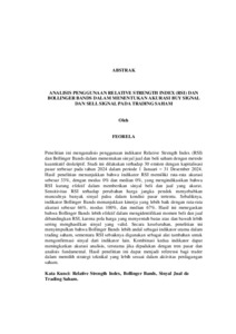 Penelitian ini menganalisis penggunaan indikator Relative Strength Index (RSI) dan Bollinger Bands dalam menentukan sinyal jual dan beli saham dengan metode kuantitatif deskriptif. Studi ini dilakukan terhadap 30 emiten dengan kapitalisasi pasar terbesar pada tahun 2024 dalam periode 1 Januari – 31 Desember 2024. Hasil penelitian menunjukkan bahwa indikator RSI memiliki rata-rata akurasi sebesar 33%, dengan modus 0% dan median 0%, yang mengindikasikan bahwa RSI kurang efektif dalam memberikan sinyal beli dan jual yang akurat. Sensitivitas RSI terhadap perubahan harga jangka pendek menyebabkan munculnya banyak sinyal palsu dalam kondisi pasar tertentu. Sebaliknya, indikator Bollinger Bands menunjukkan kinerja yang lebih baik dengan rata-rata akurasi sebesar 66%, modus 100%, dan median 67%. Hasil ini menegaskan bahwa Bollinger Bands lebih efektif dalam mengidentifikasi momen beli dan jual dibandingkan RSI, karena pola harga yang menyentuh batas atas dan bawah lebih sering menghasilkan sinyal yang valid. Secara keseluruhan, penelitian ini menyimpulkan bahwa Bollinger Bands lebih andal sebagai indikator utama dalam trading saham, sementara RSI sebaiknya digunakan sebagai alat tambahan untuk mengonfirmasi sinyal dari indikator lain. Kombinasi kedua indikator dapat meningkatkan akurasi analisis, terutama jika dipadukan dengan tren pasar dan analisis fundamental. Hasil penelitian ini dapat menjadi referensi bagi trader dalam memilih strategi teknikal yang lebih sesuai dalam aktivitas perdagangan saham. Kata Kunci: Relative Strength Index, Bollinger Bands, Sinyal Jual dan Beli, Trading Saham. This study analyzes the use of the Relative Strength Index (RSI) and Bollinger Bands indicators in determining buy and sell signals for stocks using a descriptive quantitative method. This study was conducted on 30 issuers with the largest market capitalization in 2024 for the period January 1 - December 31, 2024. The results of the study show that the RSI indicator has an average accuracy of 33%, with a mode of 0% and a median of 0%, indicating that the RSI is less effective in providing accurate buy and sell signals. The sensitivity of the RSI to short-term price changes causes many false signals to appear in certain market conditions. In contrast, the Bollinger Bands indicator shows better performance with an average accuracy of 66%, a mode of 100%, and a median of 67%. These results confirm that Bollinger Bands are more effective in identifying buy and sell moments than the RSI, because price patterns that touch the upper and lower limits more often produce valid signals. Overall, this study concludes that Bollinger Bands are more reliable as a primary indicator in stock trading, while RSI should be used as an additional tool to confirm signals from other indicators. The combination of both indicators can increase the accuracy of the analysis, especially when combined with market trends and fundamental analysis. The results of this study can be a reference for traders in choosing a more appropriate technical strategy in stock trading activities. Keywords: Relative Strength Index, Bollinger Bands, Buy and Sell Signals, Stock Trading.