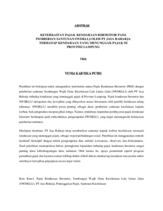 Yunia kartika putri, - (2025) KETERKAITAN PAJAK KENDARAAN BERMOTOR PADA PEMBERIAN SANTUNAN SWDKLLJ OLEH PT JASA RAHARJA TERHADAP KENDARAAN YANG MENUNGGAK PAJAK DI PROVINSI LAMPUNG. [Diploma/Tugas Akhir]