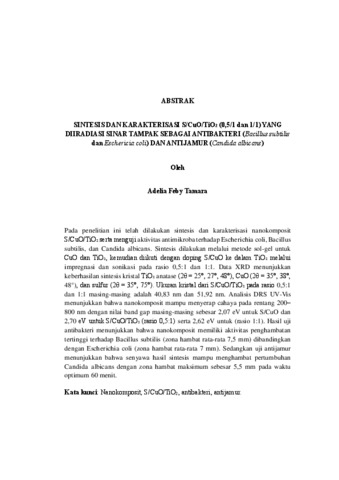 Adelia , Feby Tamara (2025) SINTESIS DAN KARAKTERISASI S/CuO/TiO2 (0,5/1 dan 1/1) YANG DIIRADIASI SINAR TAMPAK SEBAGAI ANTIBAKTERI (Bacillus subtilis dan Eschericia coli) DAN ANTIJAMUR (Candida albicans). FAKULTAS MATEMATIKA DAN ILMU PENGETAHUAN ALAM, UNIVERSITAS LAMPUNG.