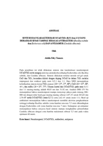 Pada penelitian ini telah dilakukan sintesis dan karakterisasi nanokomposit S/CuO/TiO2 serta menguji aktivitas antimikroba terhadap Escherichia coli, Bacillus subtilis, dan Candida albicans. Sintesis dilakukan melalui metode sol-gel untuk CuO dan TiO2, kemudian diikuti dengan doping S/CuO ke dalam TiO2 melalui impregnasi dan sonikasi pada rasio 0,5:1 dan 1:1. Data XRD menunjukkan keberhasilan sintesis kristal TiO2 anatase (2θ = 25°, 27°, 48°), CuO (2θ = 35°, 38°, 48°), dan sulfur (2θ = 35°, 75°). Ukuran kristal dari S/CuO/TiO2 pada rasio 0,5:1 dan 1:1 masing-masing adalah 40,83 nm dan 51,92 nm. Analisis DRS UV-Vis menunjukkan bahwa nanokomposit mampu menyerap cahaya pada rentang 200– 800 nm dengan nilai band gap masing-masing sebesar 2,07 eV untuk S/CuO dan 2,70 eV untuk S/CuO/TiO2 (rasio 0,5:1) serta 2,62 eV untuk (rasio 1:1). Hasil uji antibakteri menunjukkan bahwa nanokomposit memiliki aktivitas penghambatan tertinggi terhadap Bacillus subtilis (zona hambat rata-rata 7,5 mm) dibandingkan dengan Escherichia coli (zona hambat rata-rata 7 mm). Sedangkan uji antijamur menunjukkan bahwa senyawa hasil sintesis mampu menghambat pertumbuhan Candida albicans dengan zona hambat maksimum sebesar 5,5 mm pada waktu optimum 60 menit. Kata kunci: Nanokomposit, S/CuO/TiO2, antibakteri, antijamur. In this research, the synthesis and characterization of the S/CuO/TiO2 nanocomposite were carried out, along with evaluation of its antimicrobial activity against Escherichia coli, Bacillus subtilis, and Candida albicans. The synthesis was conducted using the sol-gel method for CuO and TiO2, followed by doping of S/CuO into TiO2 through impregnation and sonication at ratios of 0.5:1 and 1:1. XRD data confirmed the successful synthesis of anatase TiO2 crystals (2θ = 25°, 27°, 48°), CuO (2θ = 35°, 38°, 48°), and sulfur (2θ = 35°, 75°). The crystallite sizes of S/CuO/TiO2 were 40.83 nm for the 0.5:1 ratio and 51.92 nm for the 1:1 ratio. UV-Vis DRS analysis showed that the nanocomposites were able to absorb light in the 200–800 nm range, with respective band gap energies of 2.07 eV for S/CuO, 2.70 eV for S/CuO/TiO2 (0.5:1), and 2.62 eV for S/CuO/TiO2 (1:1). Antibacterial tests indicated that the nanocomposite exhibited the highest inhibition activity against Bacillus subtilis (average inhibition zone of 7.5 mm) compared to Escherichia coli (average inhibition zone 7 mm) Meanwhile, antifungal tests showed that the synthesized compound could inhibit the growth of Candida albicans, with a maximum inhibition zone of 5.5 mm after 60 minutes of visible light exposure. Keywoards: Nanocomposite, S/CuO/TiO2, antibacterial, antifungal.
