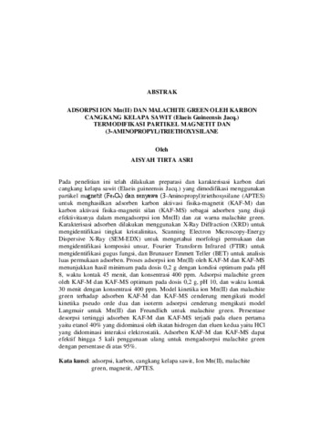 Pada penelitian ini telah dilakukan preparasi dan karakterisasi karbon dari cangkang kelapa sawit (Elaeis guineensis Jacq.) yang dimodifikasi menggunakan partikel magnetit (Fe3O4) dan senyawa (3-Aminopropyl)triethoxysilane (APTES) untuk menghasilkan adsorben karbon aktivasi fisika-magnetit (KAF-M) dan karbon aktivasi fisika-magnetit silan (KAF-MS) sebagai adsorben yang diuji efektivitasnya dalam mengadsorpsi ion Mn(II) dan zat warna malachite green. Karakterisasi adsorben dilakukan menggunakan X-Ray Diffraction (XRD) untuk mengidentifikasi tingkat kristalinitas, Scanning Electron Microscopy-Energy Dispersive X-Ray (SEM-EDX) untuk mengetahui morfologi permukaan dan mengidentifikasi komposisi unsur, Fourier Transform Infrared (FTIR) untuk mengidentifikasi gugus fungsi, dan Brunauer Emmett Teller (BET) untuk analisis luas permukaan adsorben. Proses adsorpsi ion Mn(II) oleh KAF-M dan KAF-MS menunjukkan hasil minimum pada dosis 0,2 g dengan kondisi optimum pada pH 8, waktu kontak 45 menit, dan konsentrasi 400 ppm. Adsorpsi malachite green oleh KAF-M dan KAF-MS optimum pada dosis 0,2 g, pH 10, dan waktu kontak 30 menit dengan konsentrasi 400 ppm. Model kinetika ion Mn(II) dan malachite green terhadap adsorben KAF-M dan KAF-MS cenderung mengikuti model kinetika pseudo orde dua dan isoterm adsorpsi cenderung mengikuti model Langmuir untuk Mn(II) dan Freundlich untuk malachite green. Persentase desorpsi tertinggi adsorben KAF-M dan KAF-MS terjadi pada eluen pertama yaitu etanol 40% yang didominasi oleh ikatan hidrogen dan eluen kedua yaitu HCl yang didominasi interaksi elektrostatik. Adsorben KAF-M dan KAF-MS dapat efektif hingga 5 kali penggunaan ulang untuk mengadsorpsi malachite green dengan persentase di atas 95%. Kata kunci: adsorpsi, karbon, cangkang kelapa sawit, Ion Mn(II), malachite green, magnetit, APTES. In this study, carbon adsorbents were prepared and characterized from oil palm shell (Elaeis guineensis Jacq.), modified with magnetite particles (Fe3O4) and (3-Aminopropyl)triethoxysilane (APTES) to produce physically activated carbon- magnetite (KAF-M) and physically activated carbon-magnetite silane (KAF-MS). These adsorbents were evaluated for their effectiveness in adsorbing Mn(II) ions and the dye malachite green. Adsorbent characterization was conducted using X-Ray Diffraction (XRD) to assess crystallinity, Scanning Electron Microscopy- Energy Dispersive X-Ray (SEM-EDX) for surface morphology and elemental composition, Fourier Transform Infrared Spectroscopy (FTIR) for functional group identification, and Brunauer Emmett Teller (BET) analysis for surface area determination. The adsorption process of Mn(II) ions by KAF-M and KAF-MS showed minimum results at a dose of 0.2 g with optimum conditions at pH 8, contact time of 45 minutes, and concentration of 400 ppm. The adsorption of malachite green by KAF-M and KAF-MS was optimum at a dose of 0.2 g, pH 10, and contact time of 30 minutes with a concentration of 400 ppm. The adsorption kinetics of Mn(II) and malachite green followed the pseudo-second-order kinetic model, while the adsorption isotherms were best described by the Langmuir model for Mn(II) and the Freundlich model for malachite green. The highest desorption percentages for KAF-M and KAF-MS were achieved with the first eluents 40% ethanol dominated by hydrogen bonding and the second eluent HCl dominated by electrostatic interactions. Both KAF-M and KAF-MS remained effective for up to five reuse cycles in adsorbing malachite green, with adsorption percentages above 95%. Keywords: adsorption, carbon, palm shell, Mn(II) ions, malachite green, magnetite, APTES.