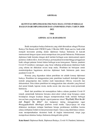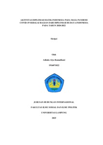 Adinda , Alya Ramadhani (2025) AKTIVITAS DIPLOMASI BATIK PADA MASA COVID-19 SEBAGAI BAGIAN DARI DIPLOMASI BUDAYA INDONESIA PADA TAHUN 2020- 2022. FAKULTAS ILMU SOSIAL DAN ILMU POLITIK, UNIVERSITAS LAMPUNG.