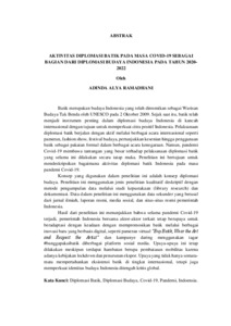 Batik merupakan budaya Indonesia yang telah diresmikan sebagai Warisan Budaya Tak Benda oleh UNESCO pada 2 Oktober 2009. Sejak saat itu, batik telah menjadi instrumen penting dalam diplomasi budaya Indonesia di kancah internasional dengan tujuan untuk memperkuat citra positif Indonesia. Pelaksanaan diplomasi batik berjalan dengan aktif melalui berbagai acara internasional seperti pameran, fashion show, festival budaya, pertunjukkan kesenian hingga penggunaan batik sebagai pakaian formal dalam berbagai acara kenegaraan. Namun, pandemi Covid-19 membawa tantangan yang besar terhadap pelaksanaan diplomasi batik yang selama ini dilakukan secara tatap muka. Penelitian ini bertujuan untuk mendeskripsikan bagaimana aktivitas diplomasi batik Indonesia pada masa pandemi Covid-19. Konsep yang digunakan dalam penelitian ini adalah konsep diplomasi budaya. Penelitian ini menggunakan jenis penelitian kualitatif deskriptif dengan metode pengumpulan data melalui studi kepustakaan (library research) dan dokumentasi. Data dalam penelitian ini menggunakan data sekunder yang berasal dari jurnal ilmiah, laporan resmi, media sosial, dan situs-situs resmi pemerintah Indonesia. Hasil dari penelitian ini menunjukkan bahwa selama pandemi Covid-19 terjadi, pemerintah Indonesia bersama aktor-aktor terkait tetap berupaya untuk beradaptasi dengan keadaan dengan mempromosikan batik melalui berbagai inovasi baru yang berbasis digital, seperti pameran virtual “Buy Batik, Wear the Art and Respect the Artist” dan kampanye daring menggunakan tagar #banggapakaibatik diberbagai platform sosial media. Upaya-upaya ini tetap dilakukan meskipun terdapat hambatan berupa pembatasan mobilitas karena adanya kebijakan lockdown dan penurunan ekspor. Upaya yang tidak hanya semata- mata mempertahankan eksistensi batik di tingkat internasional, tetapi juga memperkuat identitas budaya Indonesia ditengah kritis global. Kata Kunci: Diplomasi Batik, Diplomasi Budaya, Covid-19, Pandemi, Indoensia. Batik is an Indonesian culture that has been officially recognized as an Intangible Cultural Heritage by UNESCO on October 2, 2009. Since then, batik has become an important instrument in Indonesian cultural diplomacy on the international stage with the aim of strengthening Indonesia's positive image. The implementation of batik diplomacy is actively carried out through various international events such as exhibitions, fashion shows, cultural festivals, art performances and the use of batik as formal clothing in various state events. However, the Covid-19 pandemic has brought major challenges to the implementation of batik diplomacy which has so far been carried out face-to-face. This study aims to describe how Indonesian batik diplomacy activities were during the Covid-19 pandemic. The concept used in this study is the concept of cultural diplomacy. This study uses a descriptive qualitative research type with data collection methods through library research and documentation. The data in this study uses secondary data from scientific journals, official reports, social media, and official websites of the Indonesian government. The results of this study show that during the Covid-19 pandemic, the Indonesian government together with related actors continued to try to adapt to the situation by promoting batik through various new digital-based innovations, such as the virtual exhibition "Buy Batik, Wear the Art and Respect the Artist" and online campaigns using the hashtag #banggapakaibatik on various social media platforms. These efforts were continued despite obstacles in the form of mobility restrictions due to the lockdown policy and declining exports. Efforts that not only maintain the existence of batik at the international level but also strengthen Indonesia's cultural identity amidst the global crisis. Keywords: Batik Diplomacy, Cultural Diplomacy, Covid-19, Pandemic, Indonesia.