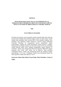 Penelitian ini bertujuan untuk mengetahui apakah pengaruh bahan baku halal dan persepsi halal terhadap minat pembelian dengan country of origin sebagai variabel mediasi pada pembelian menu restoran KFC di Kota Bandar Lampung. Jenis penelitian yang digunakan adalah explanatory research dengan pendekatan kuantitatif. Penelitian ini menggunakan metode pengambilan sampel nonprobability sampling dan teknik pengambilan sampel purposive sampling. Pengumpulan data didapat melalui situs kuesioner Google Form yang disebarkan melalui platform media sosial, sehingga menghasilkan sampel sebanyak 97 responden. Analisis data menggunakan Structural Equation Model PLS dengan pengujian inner model, outer model, dan uji hipotesis. Hasil penelitian menunjukkan bahwa variabel yang berpengaruh positif dan signifikan terdapat pada hipotesis 1,3,5,6, dan 7. Sedangkan variabel yang berpengaruh negatif dan tidak signifikan terdapat pada hipotesis 2 dan 4. Kata kunci: Bahan Baku Halal, Persepsi Halal, Minat Pembelian, Country of Origin This research aims to determine the effect of halal raw materials and halal perceptions on purchase intention with country of origin as a mediating variable for purchasing KFC restaurant menu in Bandar Lampung City. The type of research using explanatory research with a quantitative approach. This research using nonprobability sampling method and purposive sampling technique. Data collection research was obtained through the Google Form site questionnaire which was distributed via social media platforms, resulting in a sample of 97 respondents. Data analysis using Structural Equation Model PLS with inner model, outer model, and hypothesis testing. The results of research indicate that halal raw materials, halal perceptions, and country of origin had a positive and significant influence on the purchase intention of the KFC menu in Bandar Lampung.The results this study indicate that positive and significant effect found on hypothesis 1, 3, 5, 6, and 7. While negative and insignificant effect found on hypothesis 2 and 4. Keywords: Halal Raw Materials, Halal Perception, Purchase Intention, Country of Origin
