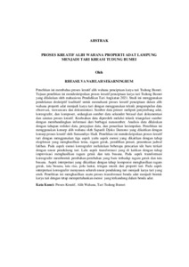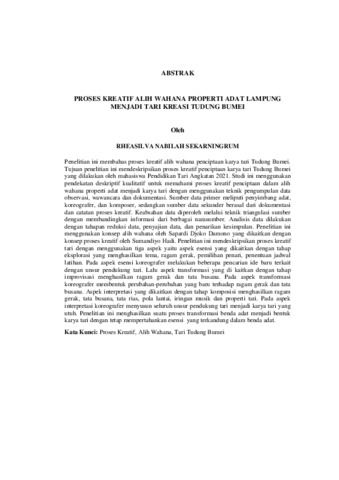 Penelitian ini membahas proses kreatif alih wahana penciptaan karya tari Tudung Bumei. Tujuan penelitian ini mendeskripsikan proses kreatif penciptaan karya tari Tudung Bumei yang dilakukan oleh mahasiswa Pendidikan Tari Angkatan 2021. Studi ini menggunakan pendekatan deskriptif kualitatif untuk memahami proses kreatif penciptaan dalam alih wahana properti adat menjadi karya tari dengan menggunakan teknik pengumpulan data observasi, wawancara dan dokumentasi. Sumber data primer meliputi penyimbang adat, koreografer, dan komposer, sedangkan sumber data sekunder berasal dari dokumentasi dan catatan proses kreatif. Keabsahan data diperoleh melalui teknik triangulasi sumber dengan membandingkan informasi dari berbagai narasumber. Analisis data dilakukan dengan tahapan reduksi data, penyajian data, dan penarikan kesimpulan. Penelitian ini menggunakan konsep alih wahana oleh Sapardi Djoko Damono yang dikaitkan dengan konsep proses kreatif oleh Sumandiyo Hadi. Penelitian ini mendeskripsikan proses kreatif tari dengan menggunakan tiga aspek yaitu aspek esensi yang dikaitkan dengan tahap eksplorasi yang menghasilkan tema, ragam gerak, pemilihan penari, penentuan jadwal latihan. Pada aspek esensi koreografer melakukan beberapa pencarian ide baru terkait dengan unsur pendukung tari. Lalu aspek transformasi yang di kaitkan dengan tahap improvisasi menghasilkan ragam gerak dan tata busana. Pada aspek transformasi koreografer membentuk perubahan-perubahan yang baru terhadap ragam gerak dan tata busana. Aspek interpretasi yang dikaitkan dengan tahap komposisi menghasilkan ragam gerak, tata busana, tata rias, pola lantai, iringan musik dan properti tari. Pada aspek interpretasi koreografer menyusun seluruh unsur pendukung tari menjadi karya tari yang utuh. Penelitian ini menghasilkan suatu proses transformasi benda adat menjadi bentuk karya tari dengan tetap mempertahankan esensi yang terkandung dalam benda adat. Kata Kunci: Proses Kreatif, Alih Wahana, Tari Tudung Bumei This study discusses the creative process of transforming traditional cultural heritage into dance works. The objective of this research is to describe the creative process of creating Tudung Bumei dance works by students of the Dance Education Program, Class of 2021. This study uses a qualitative descriptive approach to understand the creative process of transforming traditional cultural artifacts into dance works, employing data collection techniques such as observation, interviews, and documentation. Primary data sources include traditional cultural custodians, choreographers, and composers, while secondary data sources are derived from documentation and records of the creative process. Data validity was obtained through source triangulation by comparing information from various informants. Data analysis was conducted through the stages of data reduction, data presentation, and conclusion drawing. This research employs Sapardi Djoko Damono's concept of transformation, which is linked to Sumandiyo Hadi's concept of the creative process. This study describes the creative process of dance using three aspects, namely the essence aspect, which is associated with the exploration stage that produces themes, movement variations, dancer selection, and determination of the rehearsal schedule. In the essence aspect, the choreographer conducts several searches for new ideas related to the supporting elements of dance. Then, the transformation aspect, which is associated with the improvisation stage, produces movement variations and costume design. In the transformation aspect, the choreographer creates new changes to movement variations and costume design. The interpretation aspect, which is associated with the composition stage, produces movement variations, costume design, makeup design, floor patterns, musical accompaniment, and dance props. In the interpretation aspect, the choreographer arranges all supporting elements of dance into a complete dance work. This research produces a process of transforming traditional objects into dance works while maintaining the essence contained in the traditional objects. Keywords: Creative Process, Performance Transfer, Tudung Bumei Dance